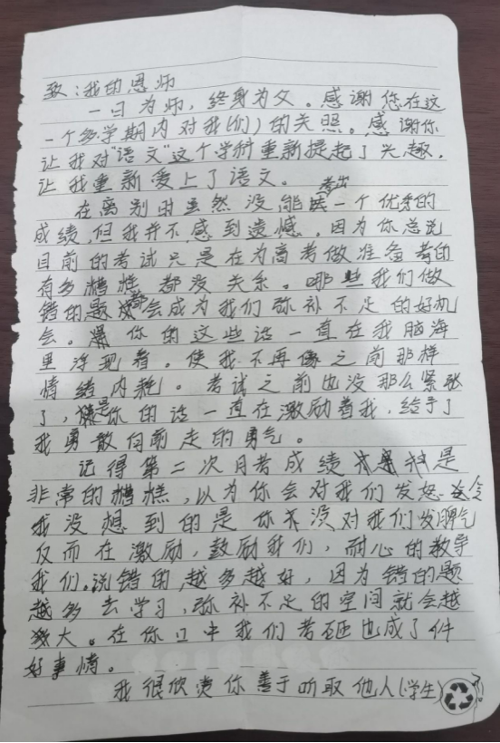 第二学期按选科分班级,班主任开完最后一次班会,我独自坐在教室角落,回忆本学期的授课一——美好且充实。在此刻也产生不舍之情,班会结束之际,应员工要求,我们一起合照。当目睹员工依依不舍地带上书本去往新班级,那一刻我红了眼,员工对我说“张老师,照顾好自己,以后不能为了上好课再熬夜备课了”。在那一刻,所有的留恋与不舍,都化为眼泪。此后我下定决心做一名员工喜欢、领导信赖、家长放心的好老师!