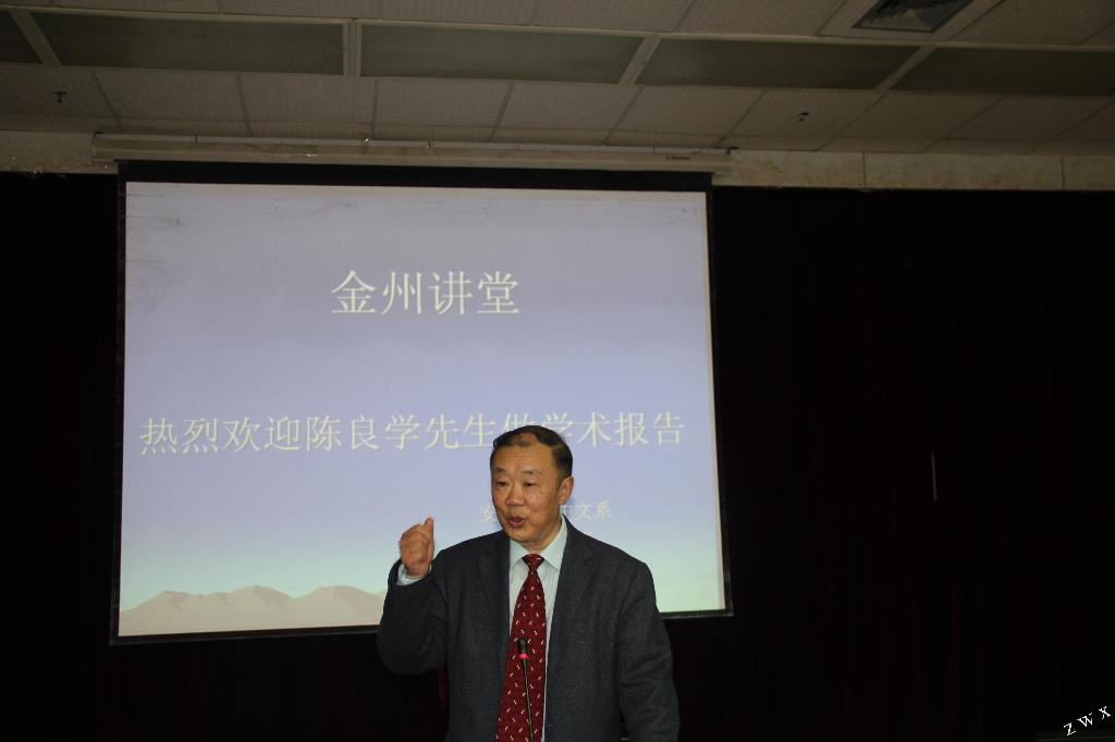 正在“金州讲堂”激情洋溢作报告的学者
