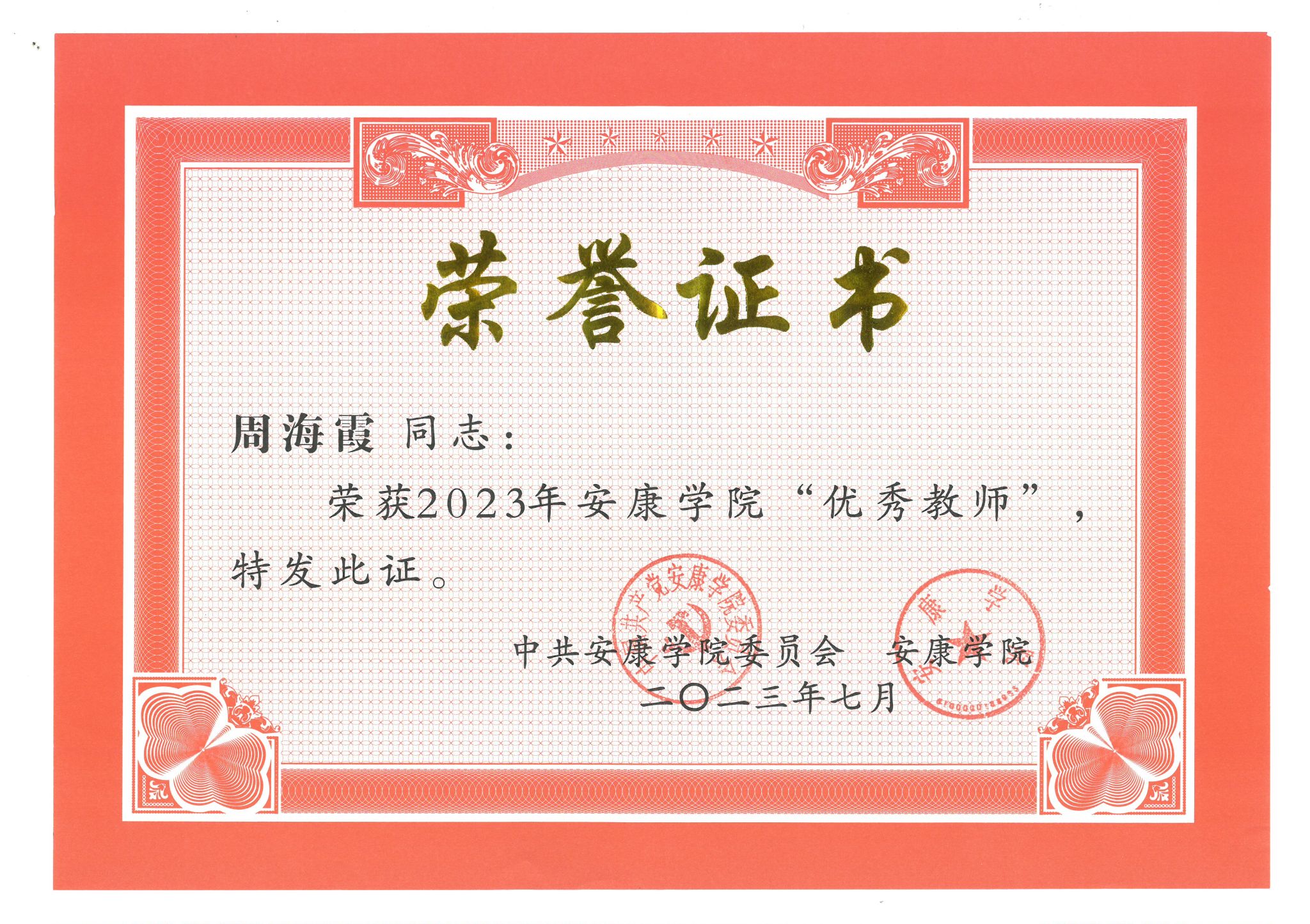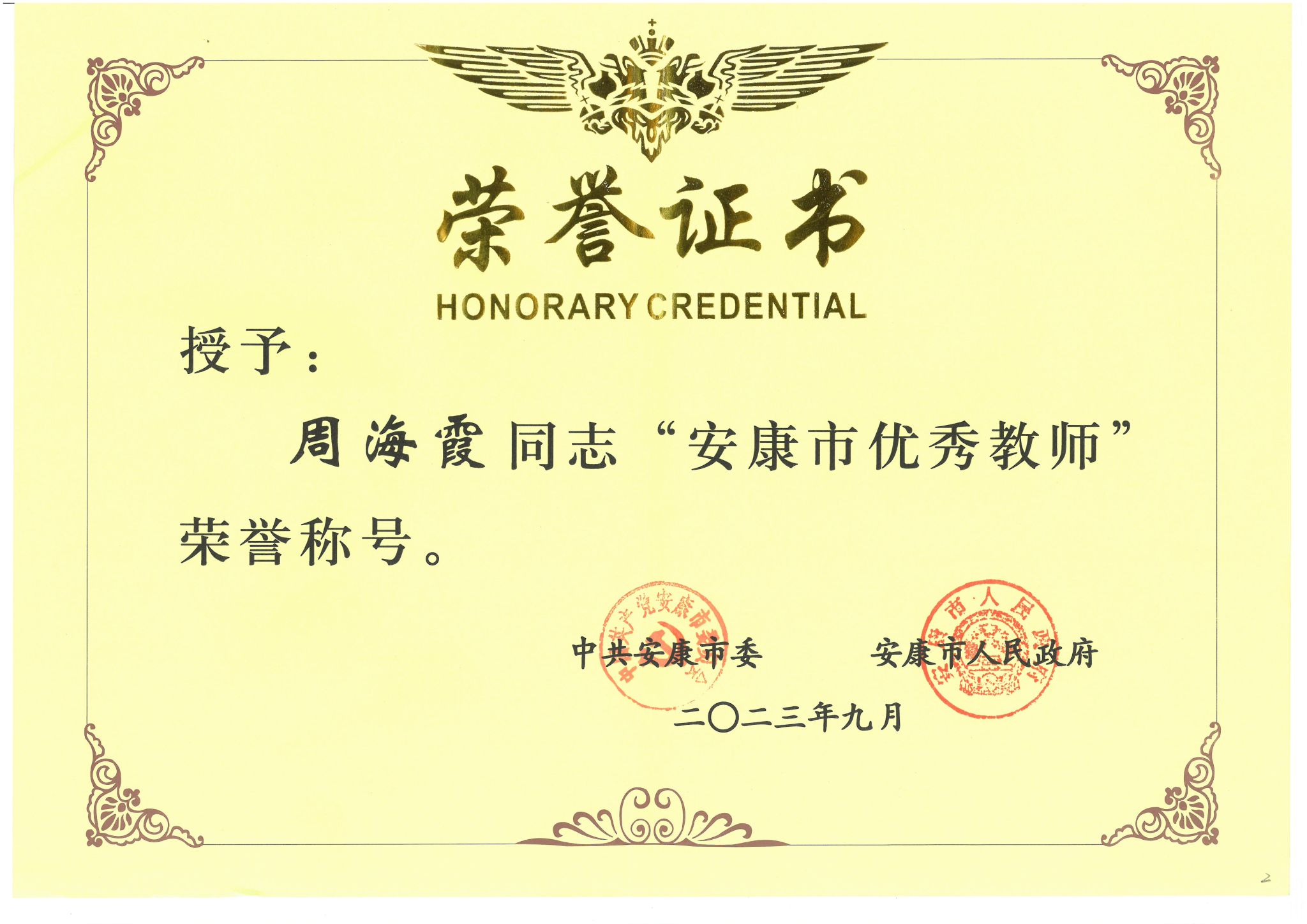 根据《关于推荐评选安康市教育工作先进集体和优秀教师、师德标兵、优秀班主任、先进教育工作者的通知》(安评组办发〔2023〕5号)精神和《2138cc太阳集团官网入口关于开展2023年校级教职工荣誉评选工作的通知》(党政办发〔2023〕16 号)相关要求,经个人申报、公司组织专家评审,公司教师周海霞被评为2138cc太阳集团官网入口优秀教师,同时被推荐参评安康市优秀教师,经安康市评审,确定周海霞为2023年安康市优秀教师。