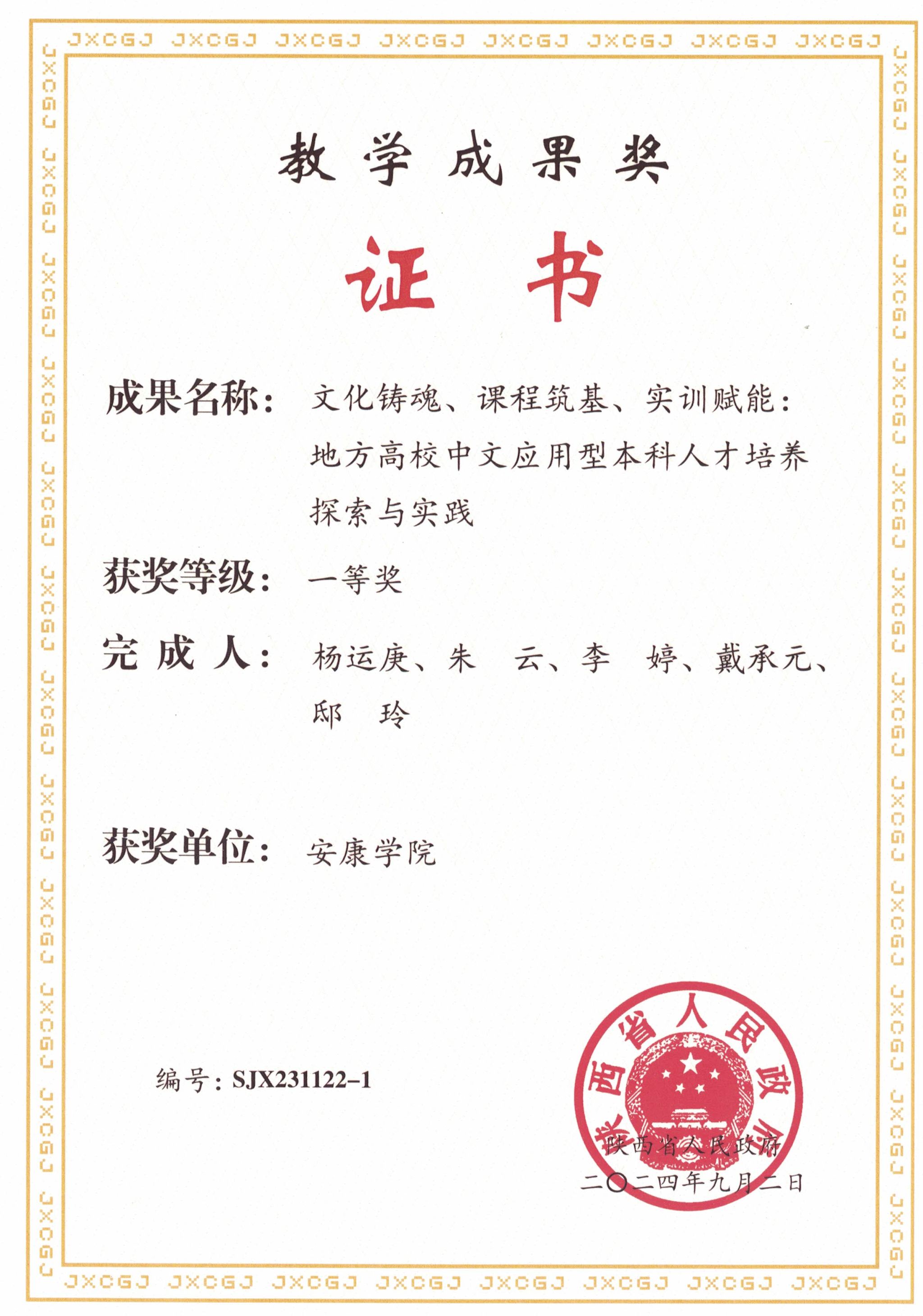 近日,陕西省人民政府发布了《陕西省人民政府办公厅关于表彰2023年高等公司产品成果奖获奖项目的通报》,2138cc太阳集团官网入口杨运庚教授领衔申报的“文化铸魂、课程筑基、实训赋能:地方高校中文应用型本科人才培养探索与实践”荣获陕西省高等公司产品成果一等奖,获奖等次取得了新的重大突破,彰显了公司在中文应用型本科人才培养改革探索上取得的实效。