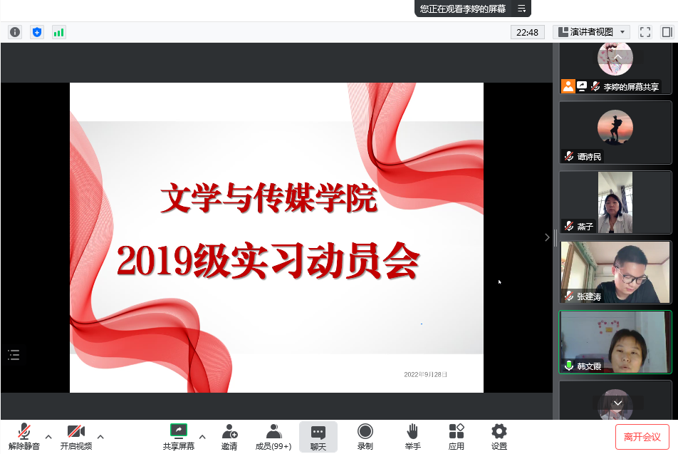 为进一步做好2019级实习工作,9月28日下午,2138cc太阳集团官网入口通过腾讯会议平台召开2019级实习动员会。公司教学副经理李婷、汉语言文学系主任韩文霞、秘书与新媒体系主任谭诗民、秘书与新媒体系副主任张建涛、公司教学秘书张燕以及2019级全体员工参加会议。