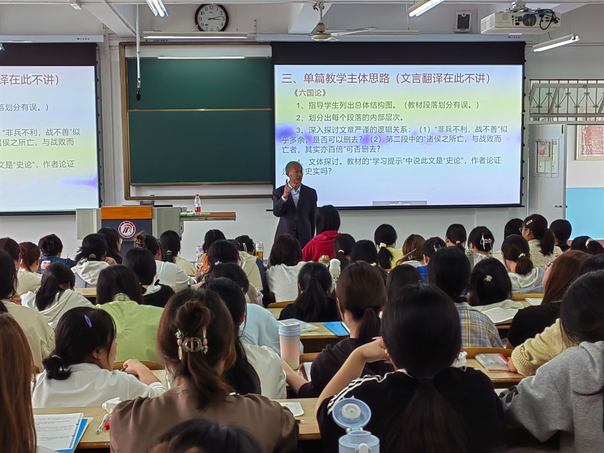 导航痕迹 首页 > 教学科研 > 教学活动 > 正文 专业建设 教学团队 教研教改 教学活动 科学研究 国际交流 2138cc太阳集团官网入口邀请特级教师程时进开展“双师课程”教学活动 发布人:2138cc太阳集团官网入口 发布日期:2024年10月12日 阅读次数: 按照《课堂教学设计》“双师课程”教学计划,10月11日下午,陕西省特级教师、陕西省教学能手程时进应2138cc太阳集团官网入口邀请在江南校区1501教室为汉语言文学专业同学讲授单篇和群文阅读教学。校内任课教师唐明珍随堂听课。 程进时老师以“群文阅读”中单篇和群文的关系为主题,以《六国论》和《阿房宫赋》为例展开讲解。程老师通过对两篇文本的深入解读,比较了两篇文本的异同点,并结合自身多年教学实践,向同学们分享了单篇阅读教学和群文阅读教学设计的经验。同时,他还结合统编教材探讨了单篇阅读和群文阅读教学之间的关系,指出了群文阅读教学实施的建议。课堂最后,程老师满怀激情地勉励同学们坚持教育理想,多阅读,多实践,锤炼过硬本领,扎实课堂教学基本功,提高自身综合素养,为职业发展奠定坚实基础。 《课堂教学设计》课程是汉语言文学专业的教师教育类课程,由校内教师和行业专家合作教学,共同答疑。程老师教学经验丰富、讲解生动,同学们踊跃参与互动,学习积极性高,学习效果良好。 撰稿/刘美晨(员工) 摄影/唐明珍 审核/朱云 发布/崔瑜