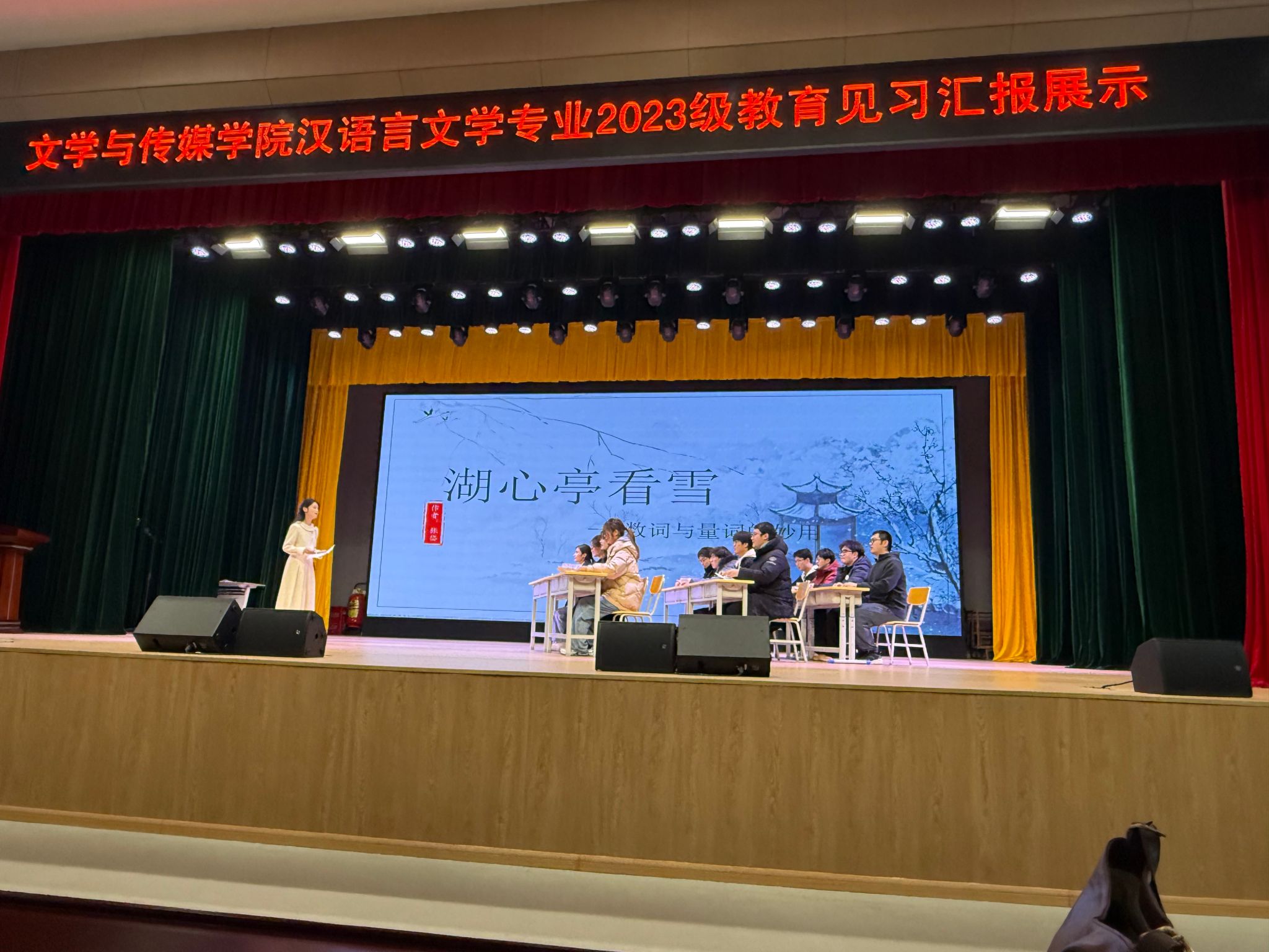 活动开始,主持人介绍了教育见习的重要意义和汉语言文学专业2023级教育见习的基本情况。活动现场,各班见习小组代表依次登台,通过精心制作的多媒体课件、生动的教学片段再现、创意编排的情景剧、详实的教学案例分析及深刻的反思总结全方位呈现了他们在三所见习公司的听课观摩、名师讲座、教研活动体验、基础教育调研等方面的收获与思考。最后,2023级1班公费师范生杨紫琪同学带来的微课教学展示《湖心亭看雪》为本次活动画上了圆满的句号。