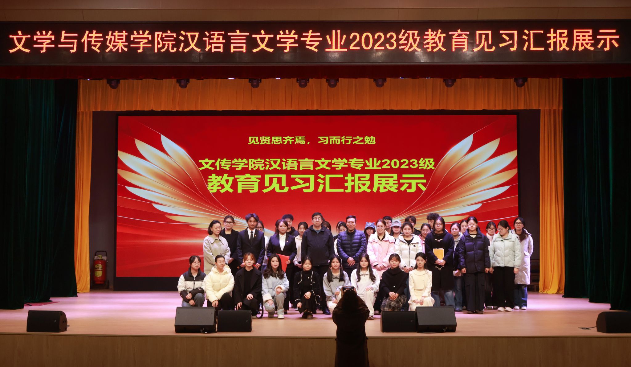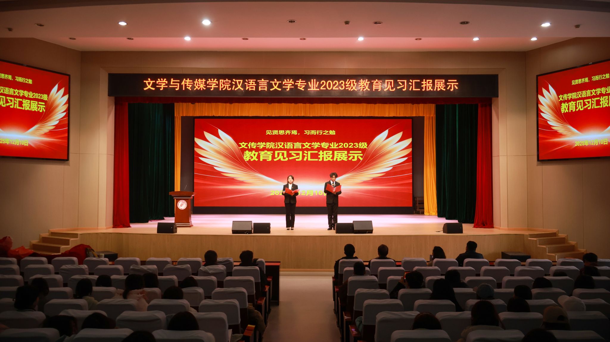 12月4日下午4点半,2138cc太阳集团官网入口在江南校区大礼堂隆重举行汉语言文学专业2023级教育见习1汇报展示活动。本次活动旨在全面检验与展示2023级员工的教育见习成果,搭建交流互鉴平台,深化师范生对中学语文公司产品的理论认知与实践体悟。公司领导、两办主任等出席活动。本次活动由学科教学论任课教师张格瑄策划指导,汉语言文学专业2023级全体员工参加。