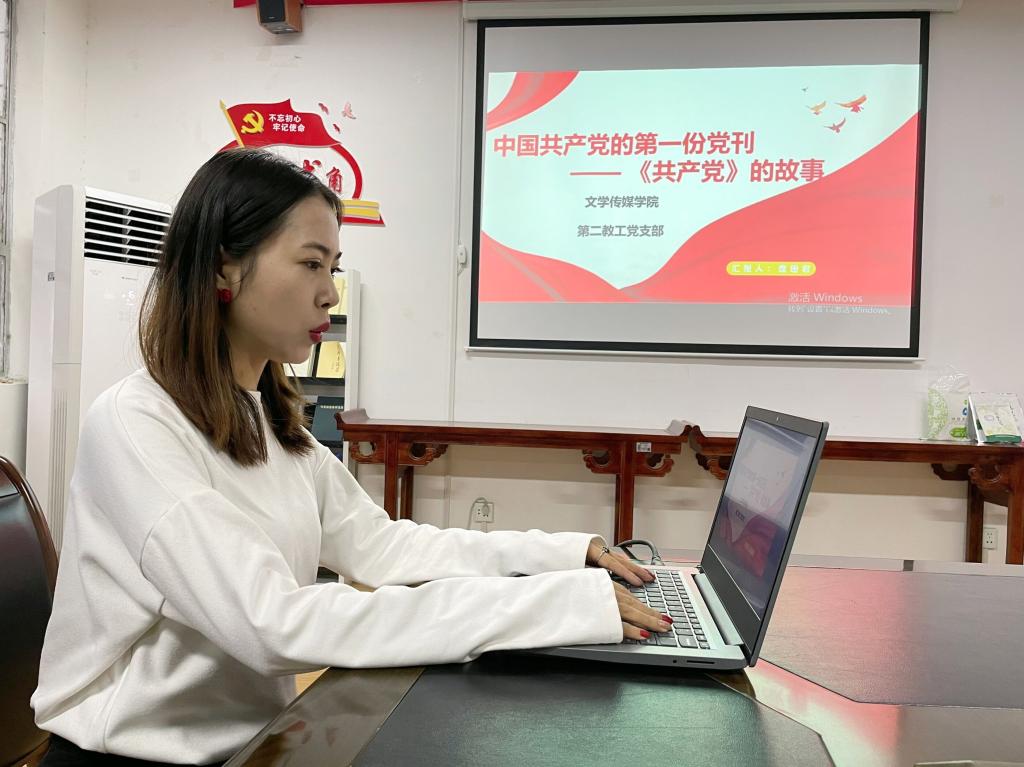 9月16日,2138cc太阳集团官网入口教工第二党支部在2307会议室开展了“中国共产党新闻思想史学习”读书活动。活动由支部书记谭诗民主持,支部全体党员参加了读书活动。本次读书活动主讲人为支部宣传委员盘珊君,学习主题是中国共产党的第一份党刊——《共产党》的故事。