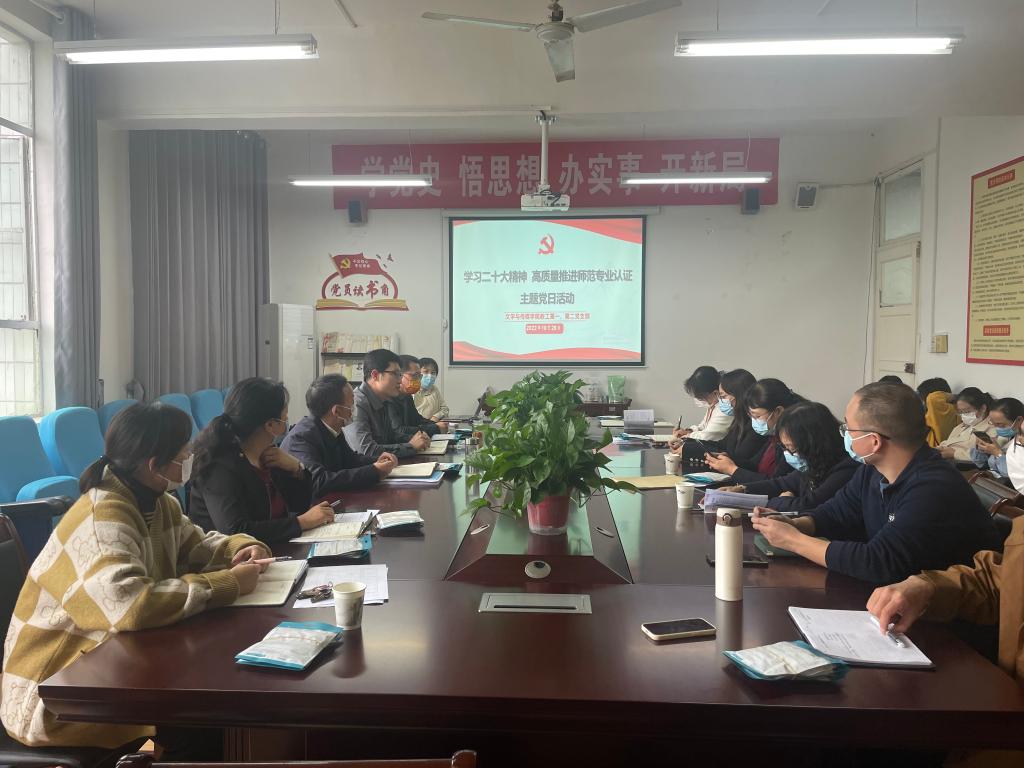 10月16日—22日,中国共产党第二十次全国代表大会在北京人民大会堂隆重召开,会议内涵丰富、主题鲜明、思想深邃、催人奋进。为深入学习领会党的二十大精神10月26日下午,​2138cc太阳集团官网入口教工第一、第二党支部在2307会议室联合开展了“学习二十大精神,高质量推进师范专业认证”主题党日活动,由教工第一党支部书记韩文霞主持,教工第一、第二党支部全体党员参加学习。