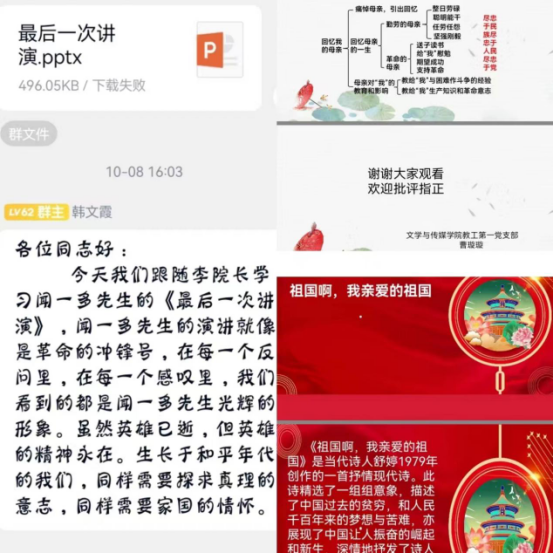 10月份由李婷、曹璇璇、余珊三位同志进行文本解读分享。李婷同志解读的《最后一次演讲》让同志们看到了闻一多先生的光辉形象,也让同志们明白虽然英雄已逝,但英雄的精神永在。生长于和平年代的我们,同样需要探求真理的意志,同样需要家国的情怀。曹璇璇同志分享的《回忆我的母亲》不仅让大家认识了一位拥有勤劳俭朴、宽厚仁德、坚强不屈等优良品质的母亲,还让大家进一步了解了忠于人民、忠于民族、忠于党的无产阶级革命家朱德同志。余珊同志分享的《祖国啊,我亲爱的祖国》让同志们看到了当时祖国的贫穷落后,也深刻感受到了作者舒婷对祖国的无比热爱、无限期盼和献身决心。