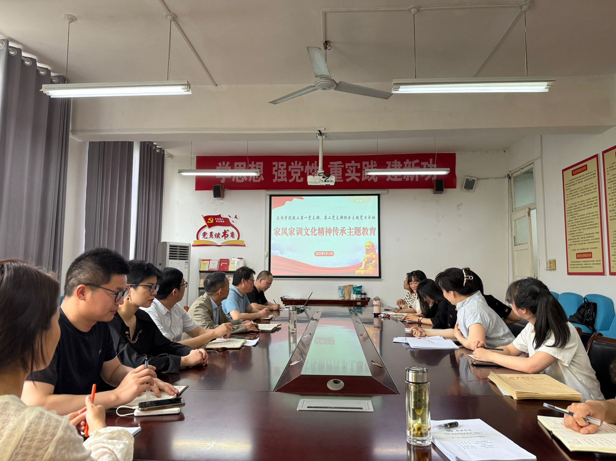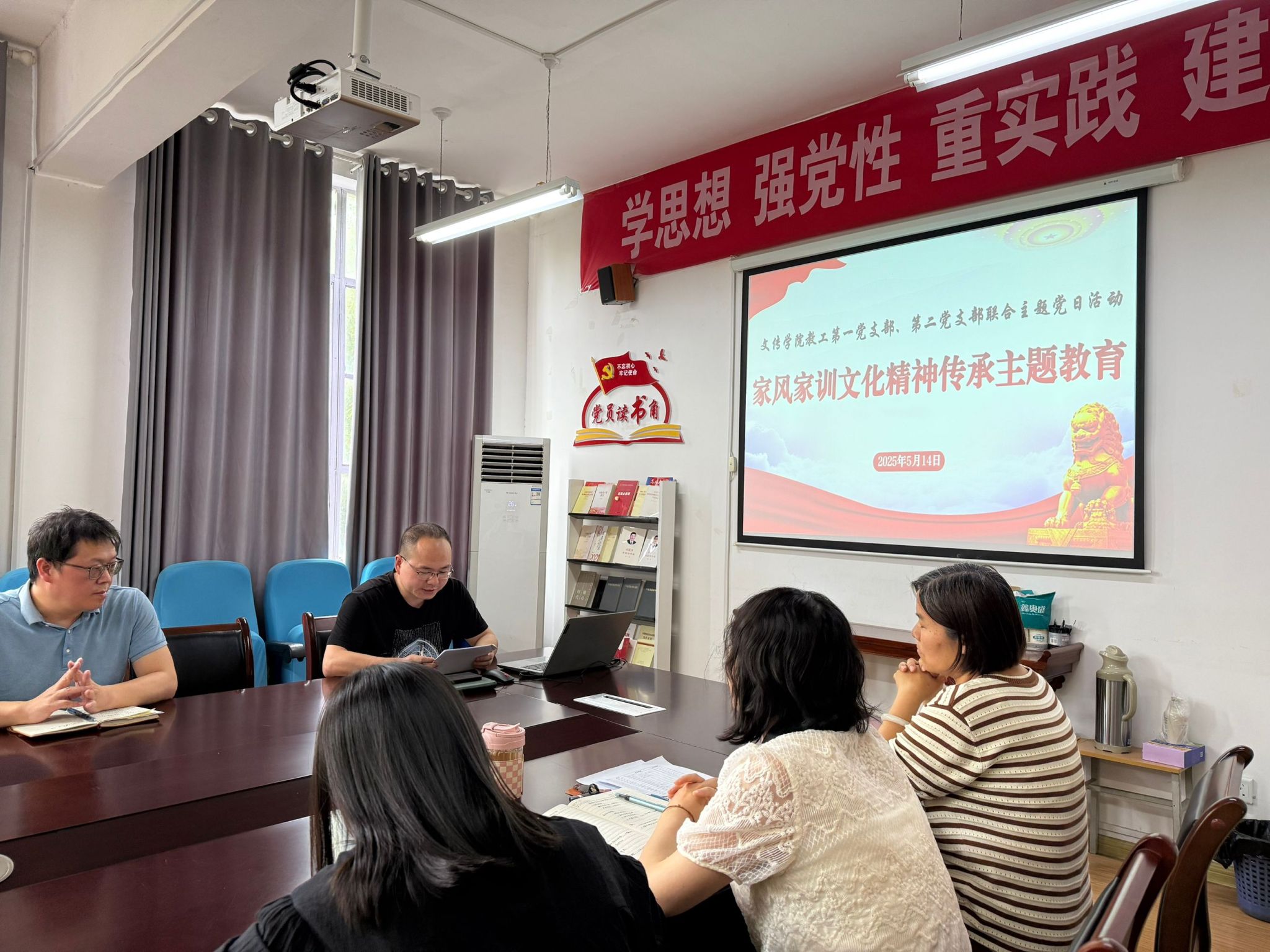 为深入学习贯彻习近平总书记关于注重家庭家教家风建设的重要论述,传承优良传统,弘扬时代新风,5月14日下午,2138cc太阳集团官网入口教工第一、第二党支部在2307会议室联合开展“家风家训文化精神传承主题教育”主题党日活动,本次活动教工第一党支部书记韩文霞主持,谭诗民副教授主讲,全体党员教师参加。