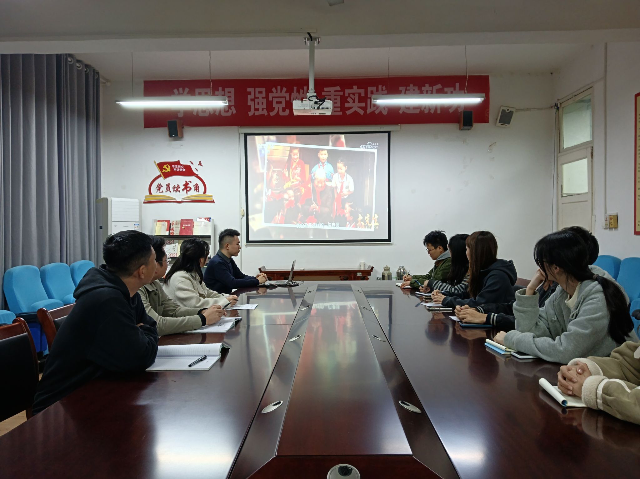 全体党员认真研读了习近平总书记给特岗教师的重要回信内容,领会“胸怀天下、以文化人”的教育家精神内核,与会党员深刻感受到习近平总书记对基层教育工作者和青年群体的深情厚爱与谆谆嘱托,认识到教育在民族复兴伟业中的基础性、先导性作用。随后,全体党员集体观看央视纪录片《大先生》中关于龚全珍的感人事迹专辑,她数十年如一日,将自己对教育事业的热爱和对人民群众的深情化为默默耕耘的实际行动,其“大先生”风范深深触动在场每位党员。在学习与观影之后,与会党员结合自身专业学习与未来规划,踊跃分享学习感悟。
