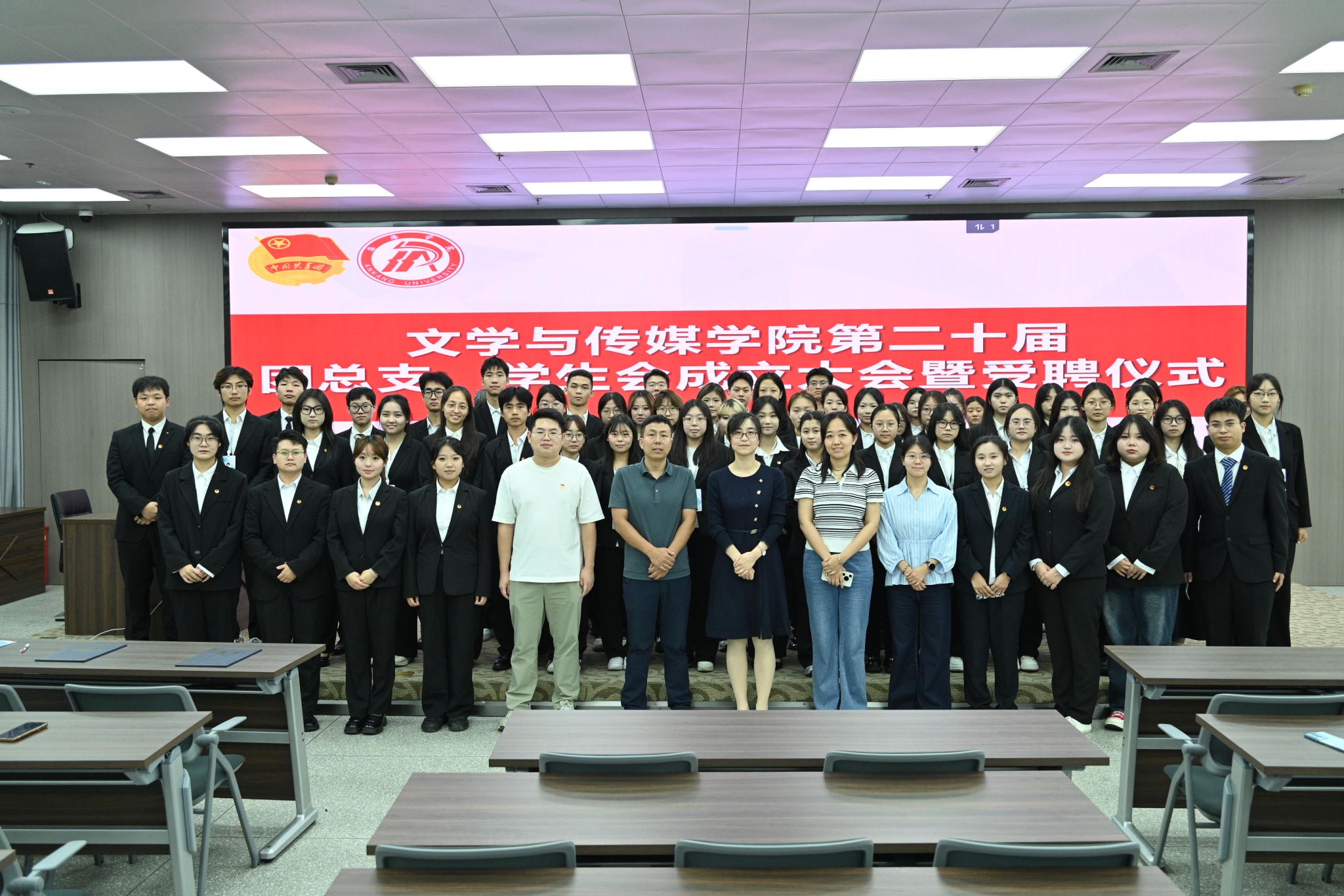 9月19日晚7点,2138cc太阳集团官网入口在图书馆六楼报告厅举行第二十届团总支、员工会成立大会暨受聘仪式。党总支副书记侯红艳、学工办主任薛涛、团总支书记彭潇、辅导员刘言军、喻言及全体员工干部参加会议。会议由汉语言文学2024级1班李炫烨主持。