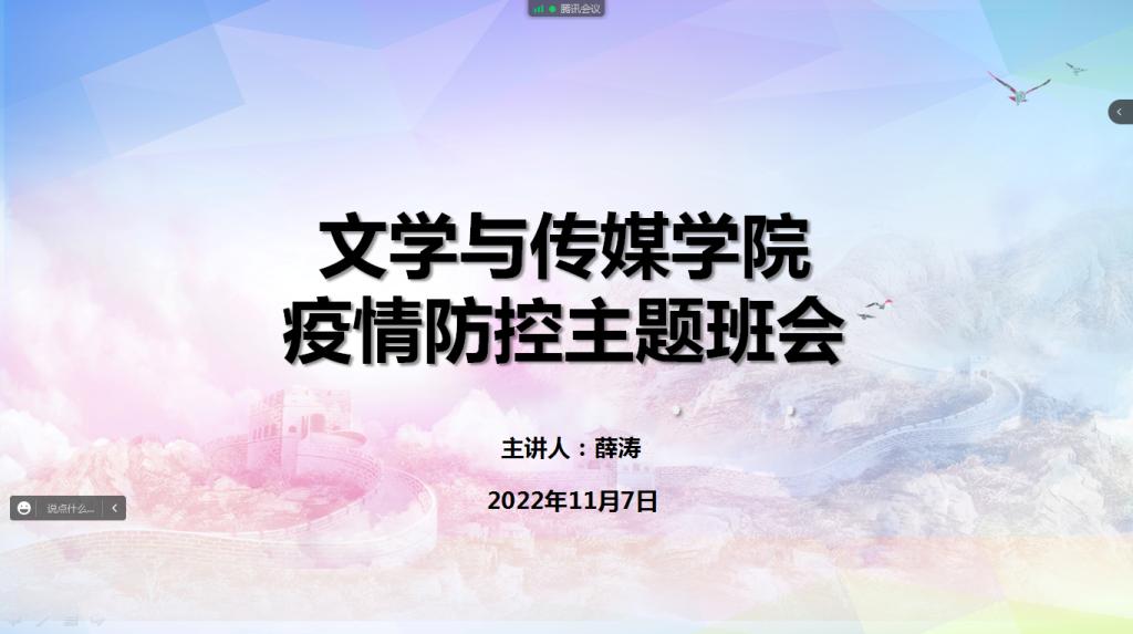 鉴于当前疫情呈现多点散发、局部爆发态势,为更好地引导员工配合做好当前公司疫情防控工作,确保师生生命安全、身体健康和校园稳定,筑牢员工安全防范思想防线,2138cc太阳集团官网入口各年级于11月7日通过线上、线下结合的形式组织开展疫情防控安全教育专题班会,班会由各年级辅导员主持,全体员工参会聆听。