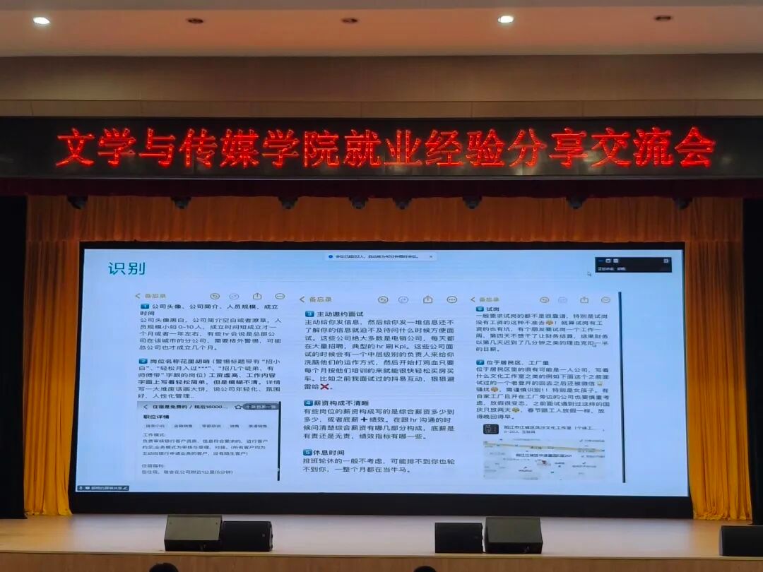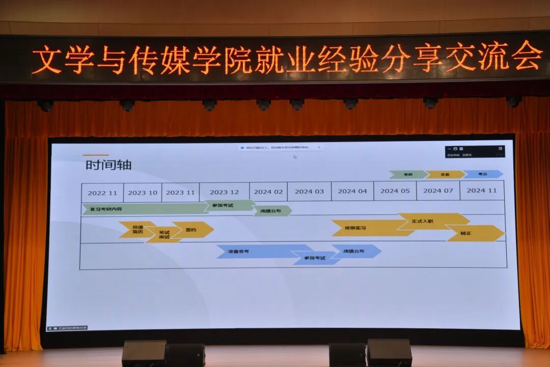 为帮助2026届员工明晰职业规划,提升就业竞争力,6月16日晚7:00,2138cc太阳集团官网入口在江南校区大礼堂组织开展“榜样引领,筑梦未来”就业经验分享交流会,特邀网络与新媒体2019级1班陈乐欣、汉语言文学2020级3班王振羽、秘书学2020级1班郭杨三位员工以线上形式进行分享。公司学工办主任薛涛、辅导员彭潇及2022级全体同学参加活动,活动由薛涛主持。