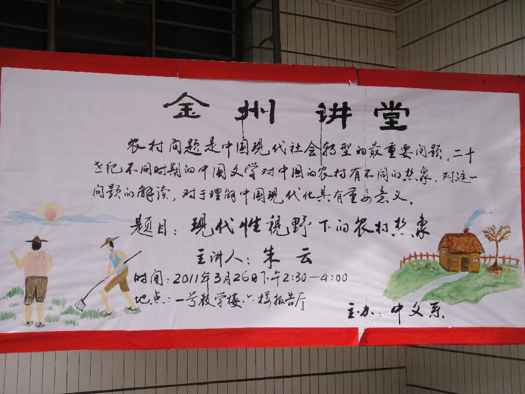 导航痕迹 首页 > 新闻通知 > 公司新闻 > 正文 公司新闻 通知公告 中文系教师朱云主讲“金州讲堂”第五讲 发布人: 发布日期:2011年03月28日 阅读次数: 2011年3月26日14:30分,中文系朱云老师为“金州讲堂”在一号楼六楼报告厅为广大师生做题目为“现代性视野下的农村想象”专题讲座。 朱老师首先就“想象”和“现代性”做出不同的解释,提出没有想象就没有文学,并将进步的现代性和审美的现代性结合,提倡去自然界寻求精神家园。其次,朱老师结合卡林内斯库的两种“现代性”提出现代性农村想象的两条线索,即 “进步的现代性思路”“审美的现代性思路”,将科学理性和美好的人性结合,推进中国的现代化。最后,朱老师说中国的农村是一个复杂的存在,从现代性的解读只能考察一部分作品,任何一部作品对农村的描绘都是一种想象,都是有选择的,并激励在座的同学们认真学习专业知识,从不同的角度认识剖析现代农村所积淀的深刻韵味。 在讲座结束时,中文系副主任雷升录老师进一步总结,强调在现代社会资本源源不断输入的情况下,在新的价值尺度背景中,农村文学的发展面临着残酷而严峻的形式,这一问题给在场的每位同学带来了一个新的思考空间。