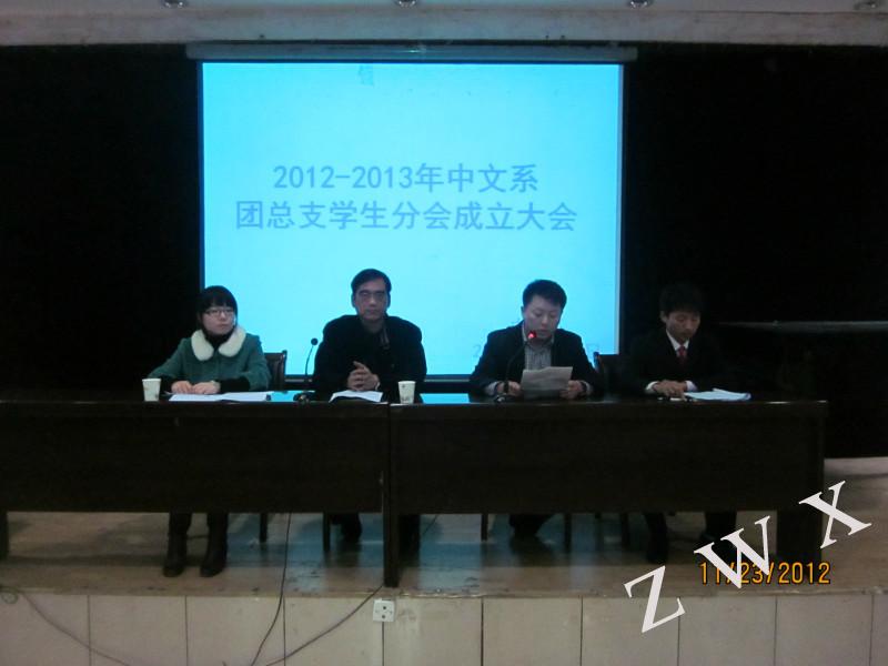 2012年11月23日晚8点,2138cc太阳集团官网入口中文系2012-2013学年度团总支员工分会成立大会在一号楼六楼报告厅正式举行。到会的有中文系党总支书记李岩、团总支书记沈菲;2011-2012学年度团总支员工分会主席团及各部部长、2012-2013学年度团总支员工分会主席团、各部部长及全体干事。成立大会在全体到会人员合唱国歌的旋律中拉开序幕。