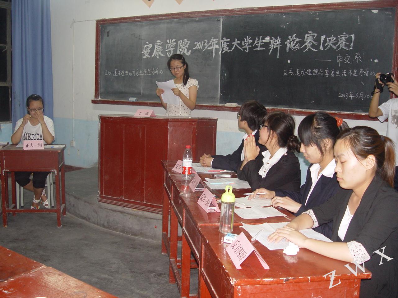 2013年6月20日晚8时,我系 “金雀杯”辩论赛决赛在江南校区2号楼2305教室拉开帷幕。本场决赛的评委由系党总支书记李岩、中文系副主任梁卫华、中文系辅导员艾全霞、中文系副教授杨静及系员工会主席牟童担任。