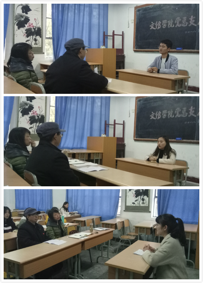 在个人陈述和回答问题环节,参与答辩的同学结合自身经历,融入时事热点问题,积极阐述了自己坚定跟党走的心路历程和不断端正入党动机的思想历程,并表示在以后的学习、工作、生活中将牢记习近平总书记在北大师生座谈会上对青年的四点希望,从自身做起,从小事做起,认真学习专业知识和党的基本理论知识,带头发挥先锋模范作用,引导全院广老员工争做建功立业新时代的有为青年。许多回答令人印象深刻。