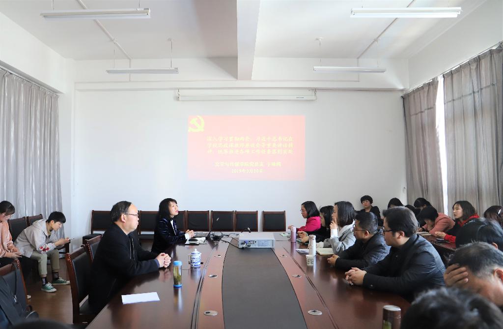 随后,于咏梅带领全体师生对《习近平看望文艺界社科界委员并参加联组会上的讲话》《习近平总书记在公司思政课教师座谈会上的重要讲话》《教育部部长陈宝生在2019年党组扩大会上的讲话》《教育部高等教育司司长吴岩在2018新闻传播公司经理论坛上的讲话》进行了系统学习。于咏梅谈到,这一系列新的重要思想、重要观点、重大判断、重大举措,具有很强的思想性、战略性、前瞻性、指导性,我们要认真学习领会,充分认识讲话的重大政治意义、理论意义、实践意义,切实把思想和行动统一到讲话精神上来。今年是中国共产党、新中国成立七十周年,纪念五四运动一百周年,同时也是全面建成小康社会的关键年。公司党总支将立足公司实际和专业建设要求,认真贯彻落实两会和习近平总书记的讲话精神。