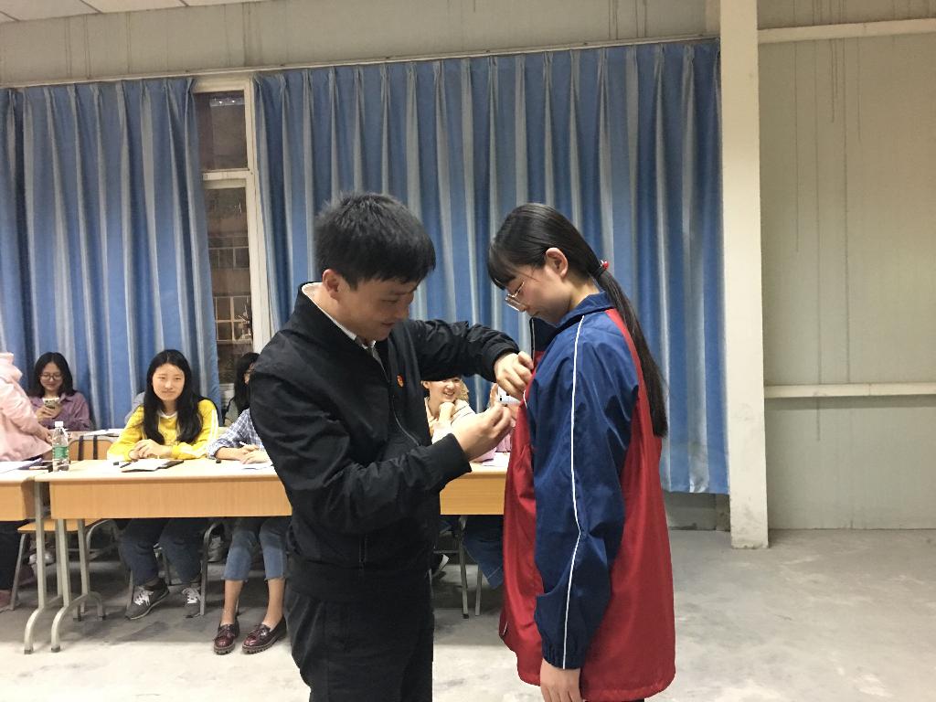 李光梓为新发展团员马妮妮佩戴团徽,他充分肯定了这次团日活动,并带领同学们重温五四运动的历史,结合习近平总书记在中共中央政治局第十四次集体学习时的重要讲话精神,强调五四精神的内核即爱国精神,爱国就是要高举中国共产党领导这面旗帜,就是要热爱共产党领导下的社会主义中国。爱国不是一句口号,要从身边的小事做起,要结合自身专业特点勇于和不良网络言论作斗争。同时他还对团干和团员青年提出三点要求,一是团干部和团员要起到表率作用,带头学好五四精神,正确和深刻认识五四运动和五四精神的历史意义和时代价值;二是团组织要发挥好组织功能,引导、帮助广大团员青年学好、认识好、践行好五四精神;三是所有青年要把五四精神的传承和时代责任及实践要求相结合,和个人的成长成才相结合,让青春的价值在实现伟大目标中散发出最耀眼的光芒。