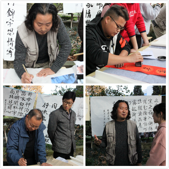 恰逢公司感恩活动月,讲座结束后,师生移步公司2号楼前林荫道,执笔墨共话感恩之情。王关棣先生现场泼墨,勾画感恩画作,并现场指导员工书写的作品,热烈的氛围,为这寒冬染上了一抹暖色。正所谓,笔墨恩情暖,诗文气象新!
