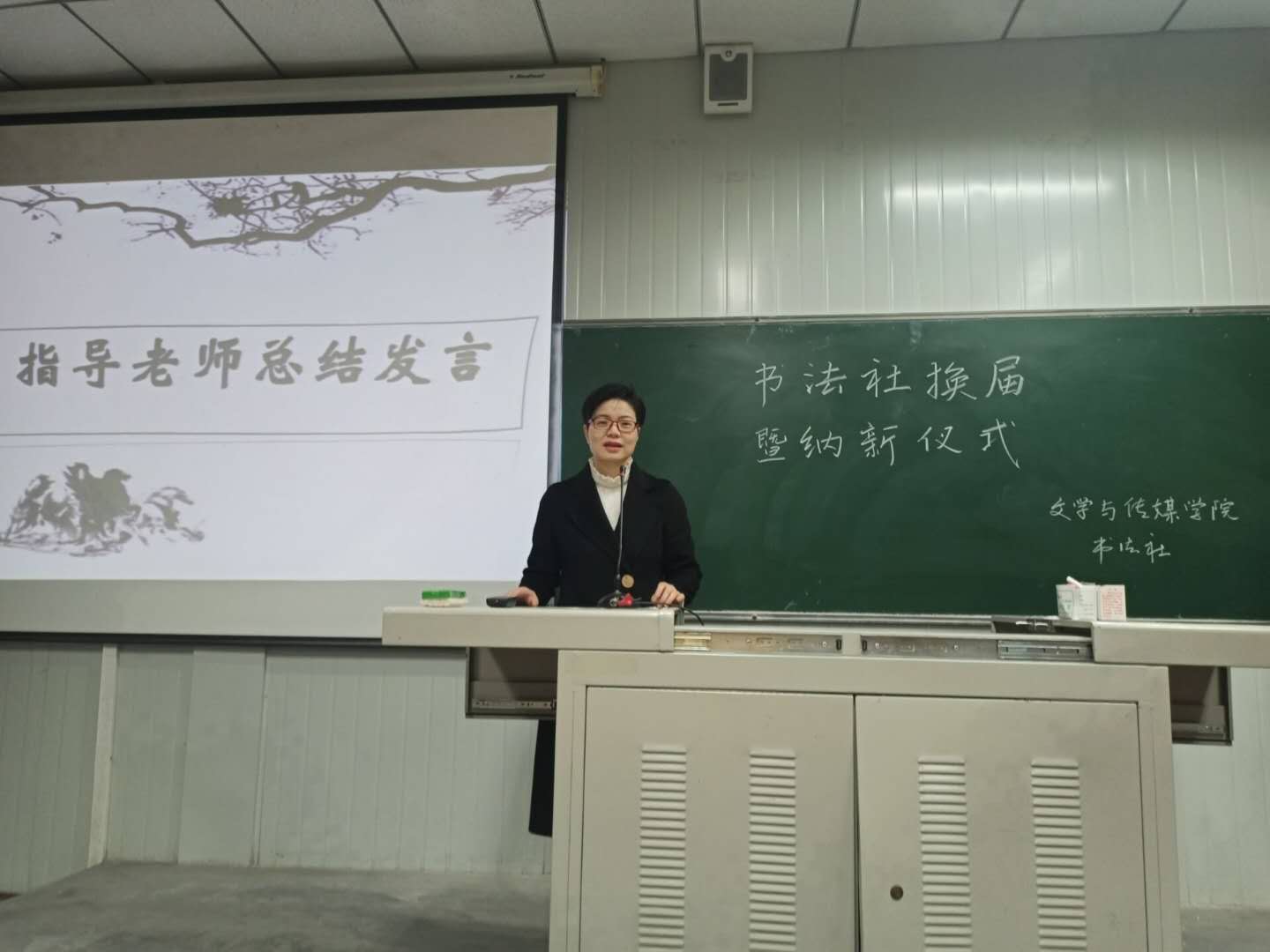 新任社长王思蓉进一步说明了书法练习时需要注意的事项,以及理应遵守的纪律,卫生等方面的问题,同时也表达了对各部门干事的期待和勉励。与会期间各部门的部长上台介绍各部门职能,让大家对于书法社有了进一步的了解。