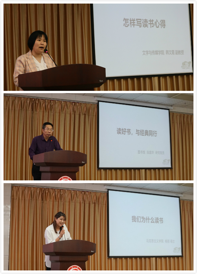 韩文霞、段昌华、杨丽三位老师为我们进行了现场的读书心得指导。韩文霞老师做了《怎样写读书心得》发言,她提到了我们现在读书存在一个重要问题——量少面窄,提倡我们在大学期间应该多读书。然后从“要读什么书”“怎么读书”“怎么写作”三方面向同学们阐述了怎样写读书心得。接下来段昌华老师做了《读好书,与经典同行》的报告,告诉了我们“何为经典、为什么要读经典、读哪些经典、在经典中推广经典著作”并总结了本次活动情况。马克思主义公司的杨丽老师向同学们谈论了《我们为什么要读书》,“读书可以减少迷茫、认识自己、增强四个自信、对人生发展进行指导”,呼吁同学们多读书。