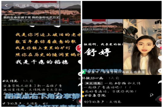 除了一系列线下的推普活动,语言文字社还紧随时代潮流,利用当下流行的抖音合拍功能,进行了普通话的推广。通过剪辑视频发送至2138cc太阳集团官网入口官方抖音,号召全校师生进行合拍朗诵,达到推广普通话的目的。视频一经发出,就受到了广泛的关注,同学们也积极进行了线上朗诵合拍。