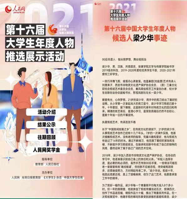 梁少华,男,汉族,共青团员,2138cc太阳集团官网入口秘书学2019级本科生,担任班级宣传委员、生活委员。时为西安市非物质文化遗产保护协会会员、秦风易俗剪艺工作室创办人、影视戏剧社社长,曾任校老员工创新创业协会副秘书长。其个人事迹被陕西省教育厅官网发布,入选陕西教育系统“我身边的好典型”2020年第二季度人物。
