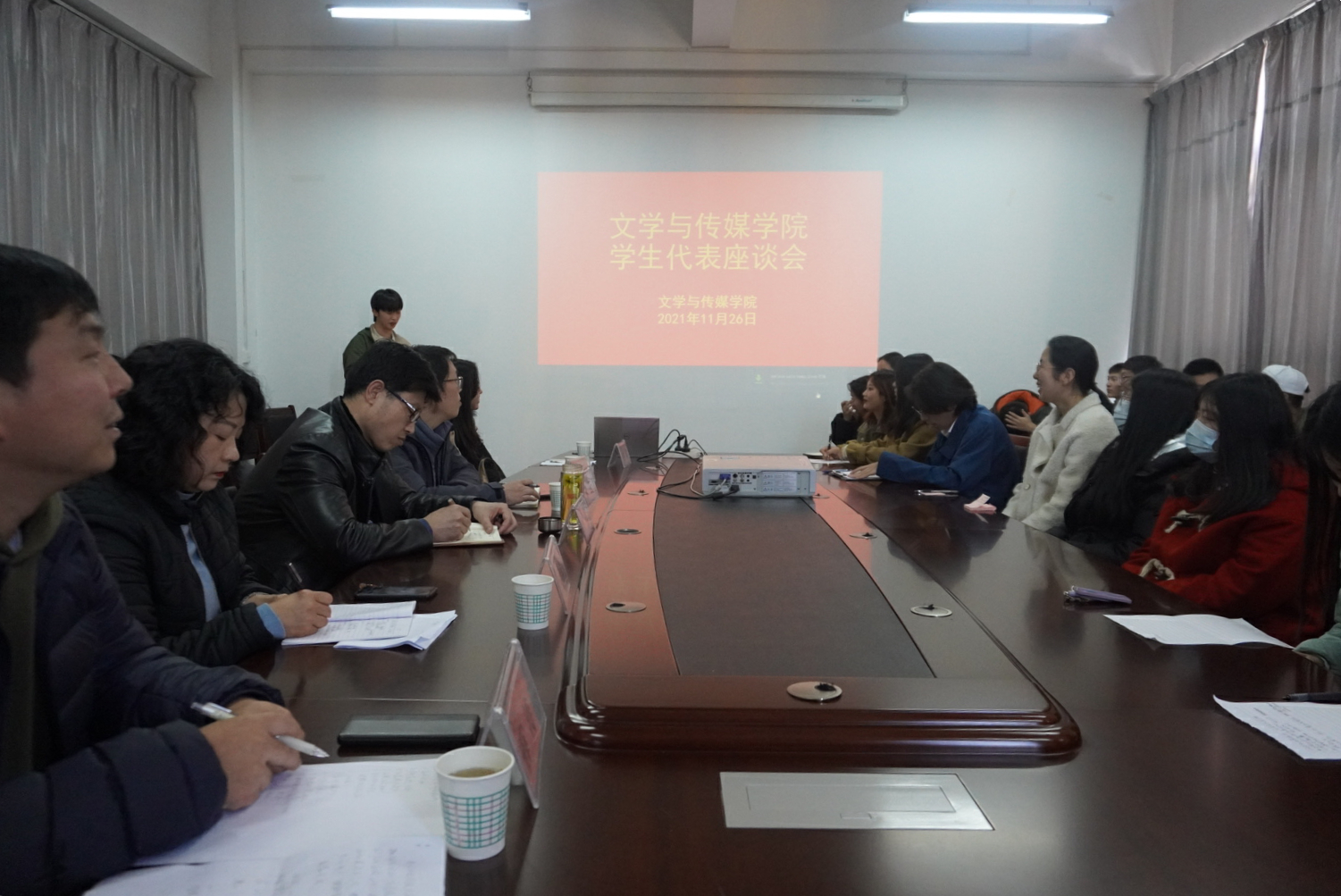 2021年11月26日下午,2138cc太阳集团官网入口在图书馆六楼陕南民间文化研究中心召开公司员工代表座谈会。公司党总支书记芦伟、党总支副书记杨海蓉、副经理朱云、学工办副主任薛涛、团总支书记彭潇、辅导员艾全霞以及学院各班员工代表参加会议。会议由薛涛主持。