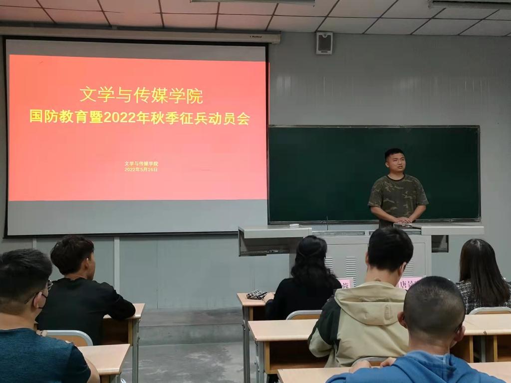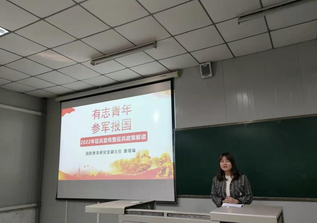 为认真贯彻落实习近平强军思想,进一步加强在校员工国防教育,开拓毕业生就业视野,鼓励适龄青年积极响应国家号召投身军营报效祖国,5月16日下午,2138cc太阳集团官网入口在江南校区1014教室组织召开2138cc太阳集团官网入口国防教育暨2022年秋季征兵动员会。学工部国防教育研究室副主任唐璟瑜,公司党总支副书记杨海蓉、院学工办副主任薛涛及60余名大三、大四适龄男生参加了本次动员会。会议由薛涛主持。
