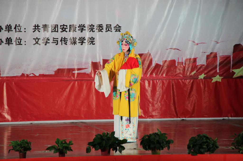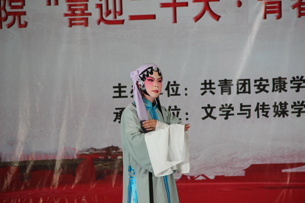 在秦声的悠悠乐曲中,演出大幕缓缓开启。上半场,热耳酸心的秦腔《黑叮本·二进宫》、《五典坡·探窑》、《五典坡·赶坡》轮番上演,一个个精美的造型令在场的师生眼前一亮,一步一景一画卷,一曲一舞一光影。由王铮、刘芳、焦钰、李月婷带来的舞蹈《旧梦惊尘》、《探窗》灵动的将上半场串联起来,恍如穿越。