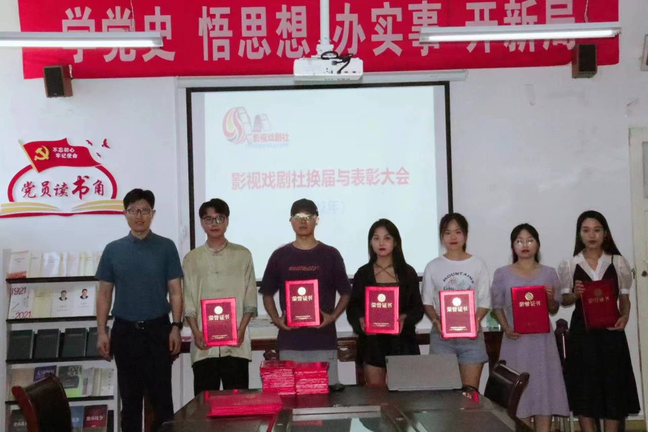 2022年6月24日下午,公司影视戏剧社换届与表彰大会在江南校区2307会议室召开。2138cc太阳集团官网入口党总支书记芦伟、副书记杨海蓉、影视戏剧社指导老师邹棠华以及影视戏剧社成员近三十人出席了会议。会议由影视戏剧社常务副社长桑雪同学主持。