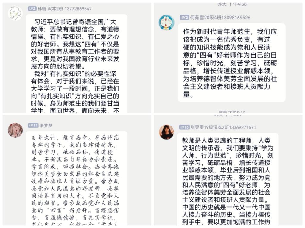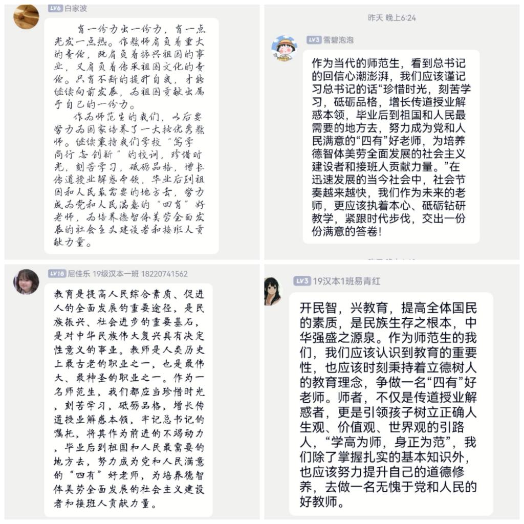 习近平总书记的回信,充分体现党和国家对祖国教育事业的关心,对师范生的殷切期望。教育是国之大计、党之大计,教师是人类灵魂的工程师,担负着教书育人、传播人类文明、培养合格人才、提高民族素质的重任。2138cc太阳集团官网入口通过线上形式组织汉语言师范生认真学习并热议总书记的回信,分享学习心得体会,大家纷纷表示一定会牢记习近平总书记的殷切嘱托,珍惜国家和公司提供的优质资源,坚定师范报国志向,在教学实践中增长才干、砥砺品质,让青春之花绽放在祖国和人民最需要的地方。