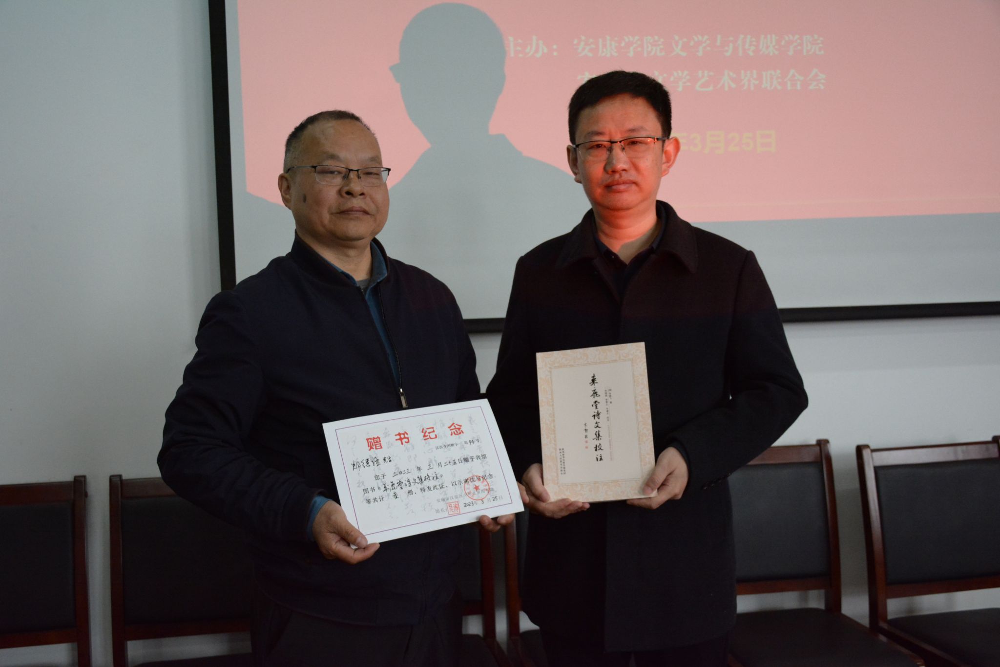致辞结束后,郑继猛教授向安康市图书馆、安康市少儿图书馆及各区县图书馆捐赠《来鹿堂诗文集校注》共计20本,安康市少儿图书馆馆长吴涛向郑继猛教授颁发了捐赠证书。