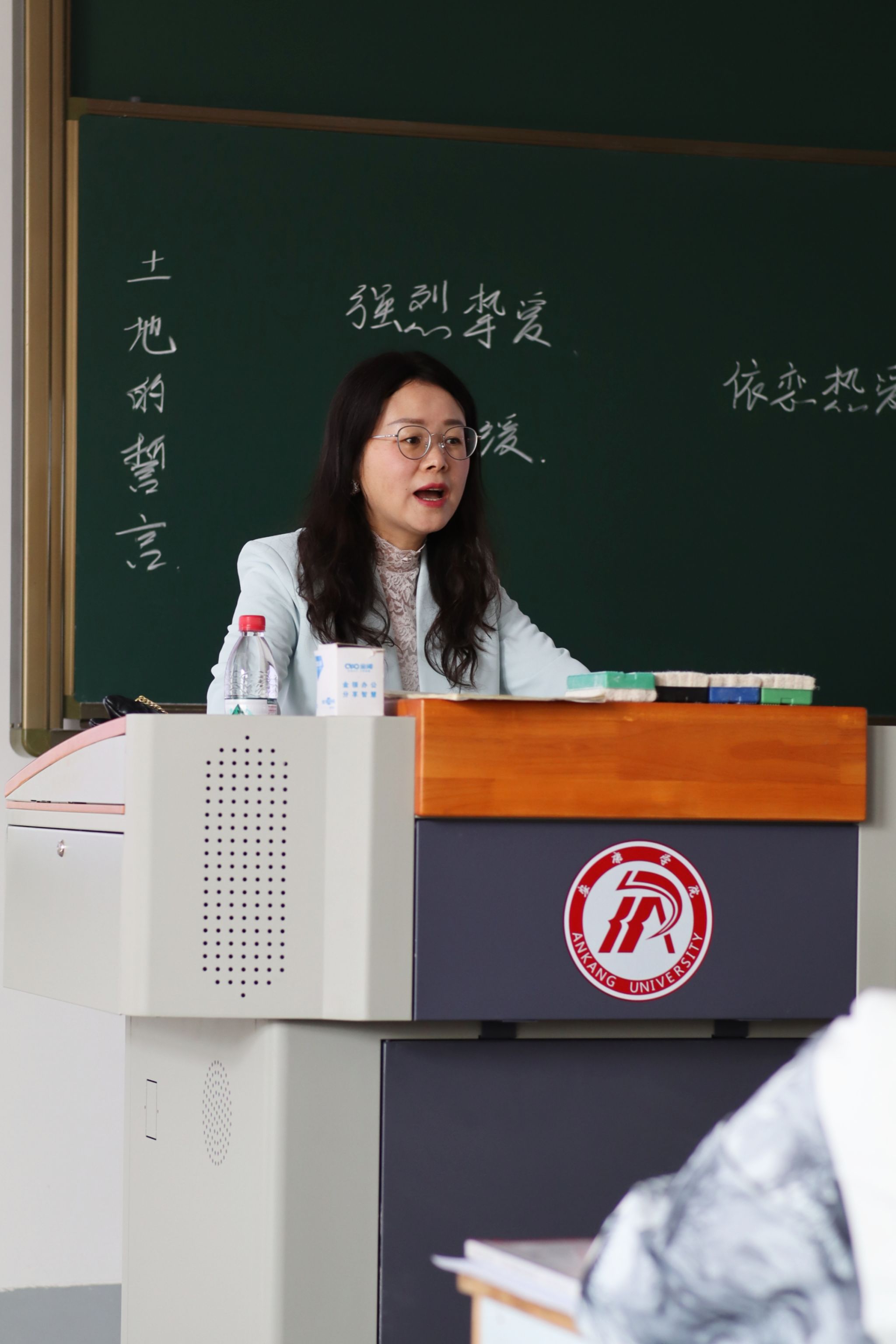 王娅莉老师围绕散文教学设计展开授课。王老师以《土地的誓言》为例进行了课堂教学展示,主要围绕“散文教学的要点探究”话题,从散文文本分析以及如何寻找教学设计的切入点等角度与同学们进行了深入地交流。