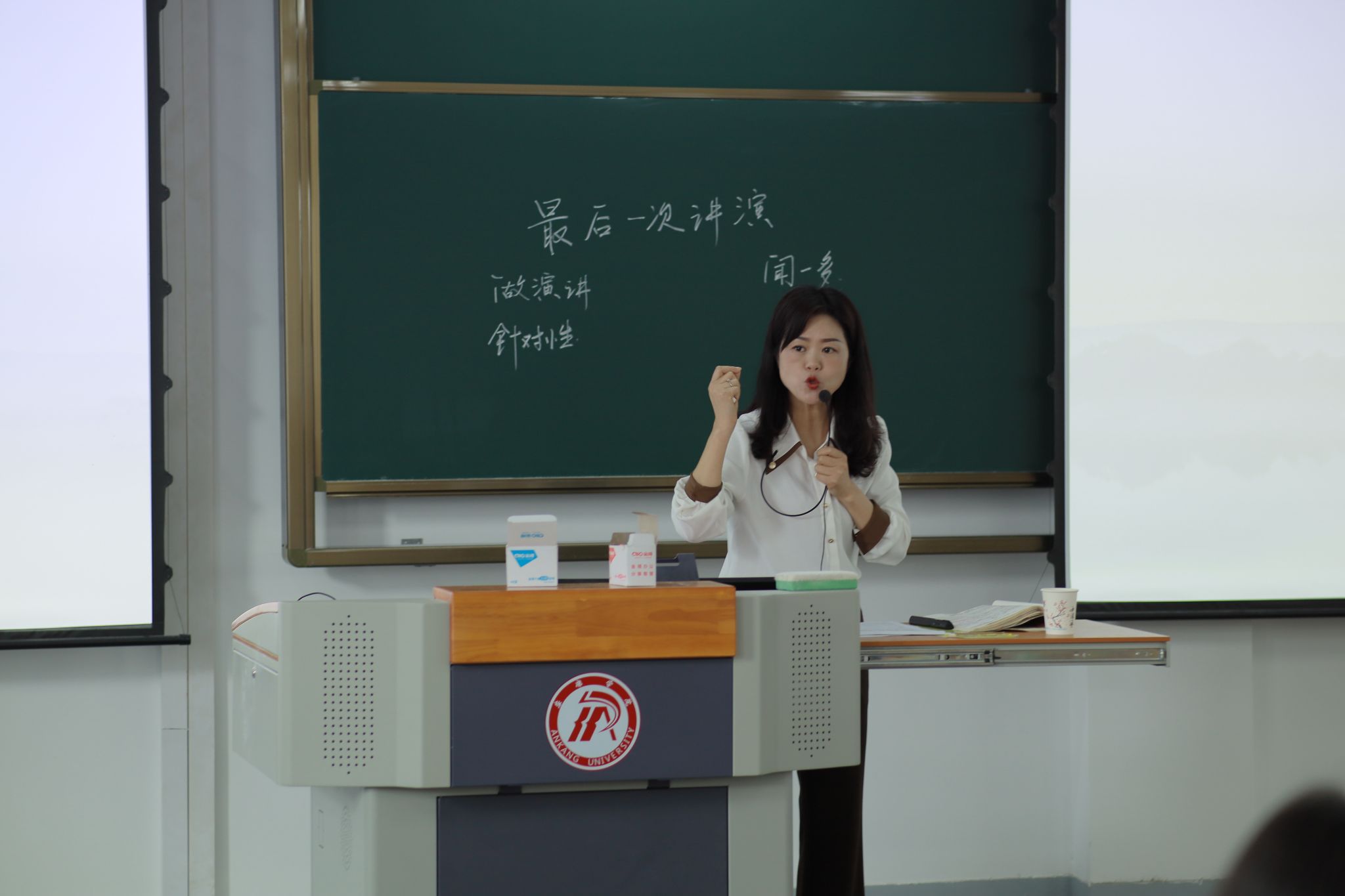 杨娟老师围绕实用文教学设计展开授课。杨老师以《最后一次讲演》为例进行了课堂教学展示,主要围绕实用文教学设计中的难点问题与同学们展开了深入地探究。