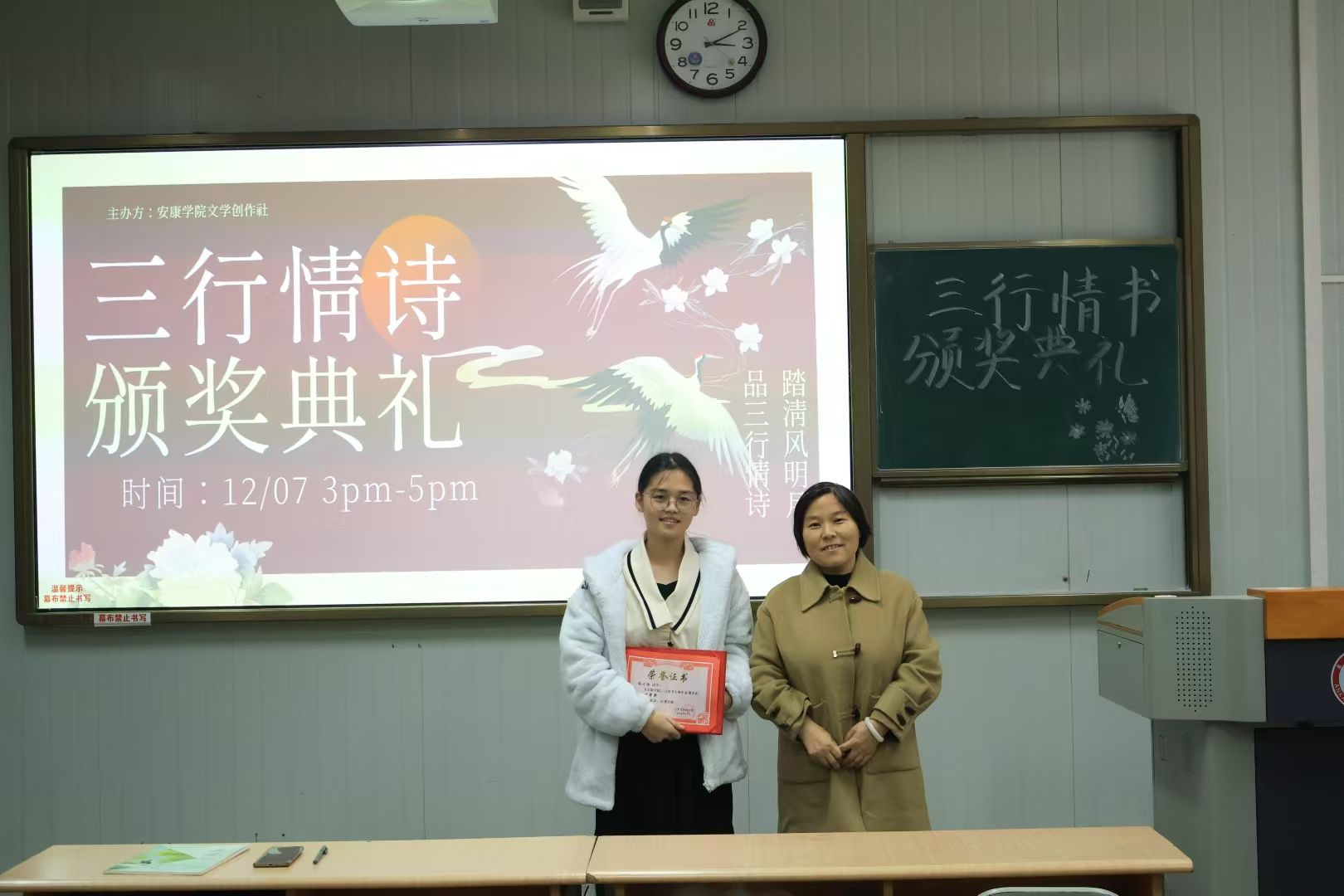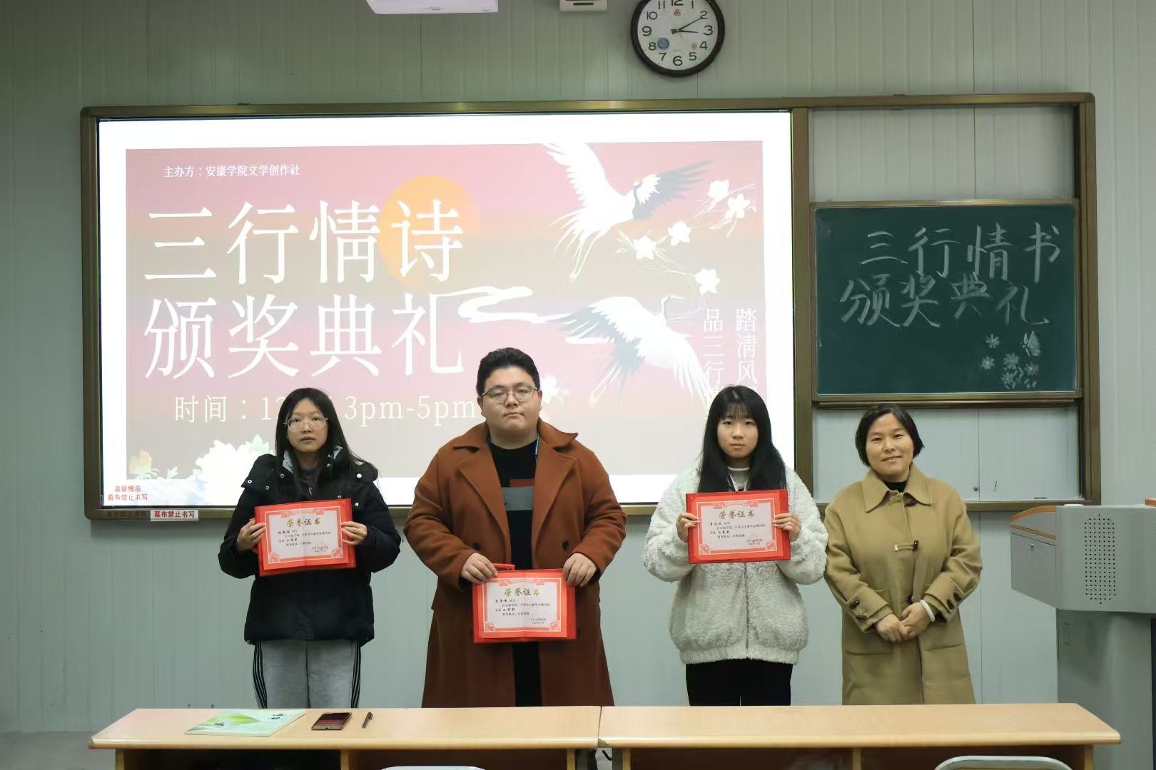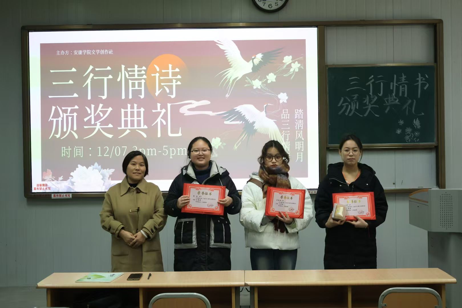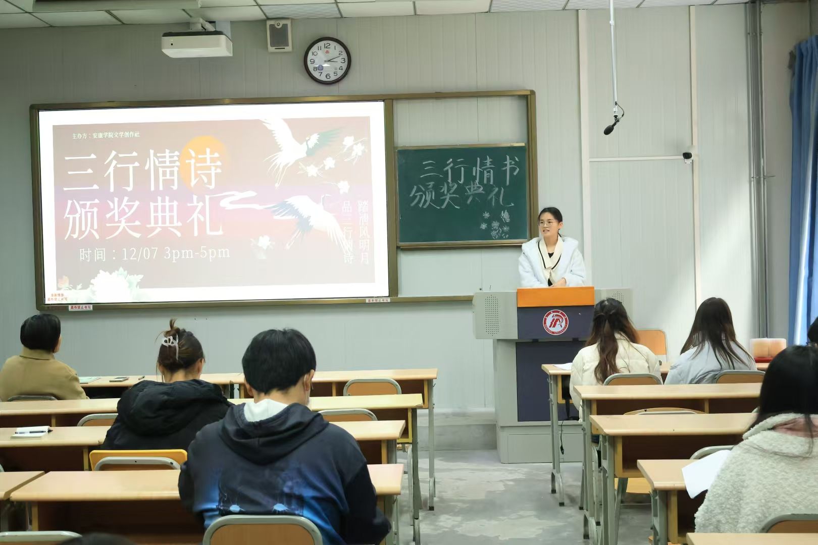 为了激发员工的创作热情,提升员工的文学素养,近期文学创作社举办了“三行情诗”大赛。经过评选,于12月7日下午在江南校区1013教室举行颁奖典礼,社团指导老师韩文霞及社团全体成员和获奖人员参与活动。