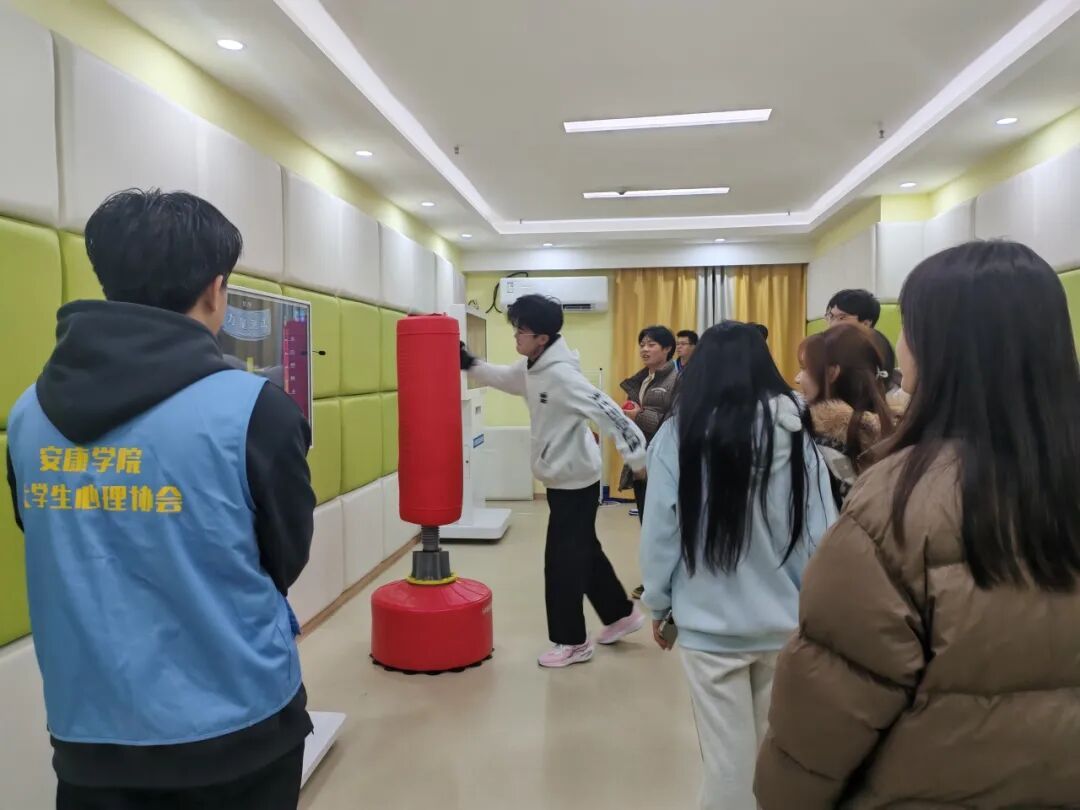 在讲解员引导下,同学们了解了公司心理健康教育中心的体系架构、日常心理咨询服务的运行机制以及服务内容,并参观个体咨询室、团体咨询室、沙盘治疗室、音乐放松室、情绪宣泄室等多个功能室。通过亲身体验击打宣泄仪器、骑行放松设备、沉浸式心理体验系统以及沙盘教具等设施,深入了解各类设备的使用方法与心理调节原理。在情绪宣泄室,不少同学在安全引导下体验了宣泄设备,直观感受到压力释放的有效途径;在沙盘活动区,大家通过摆放沙具开展自我表达,逐步理解潜意识情绪的外化过程。这种“体验—感知—理解”的参观模式,让抽象的心理知识变得具体可感。