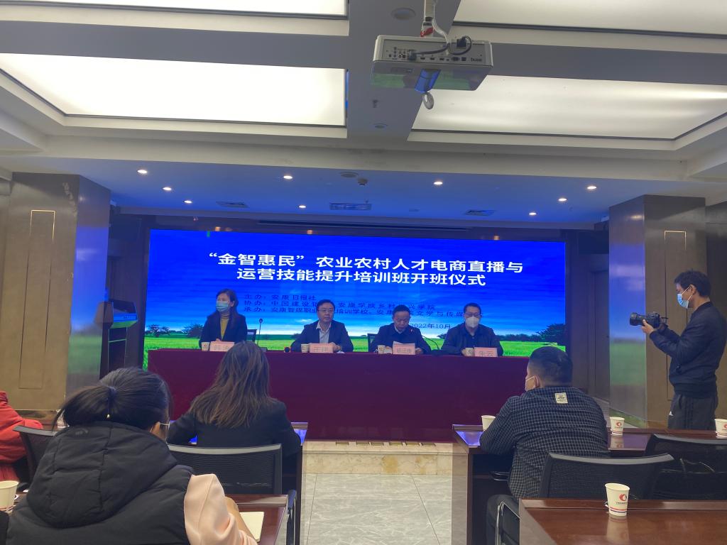 10月27日,由公司乡村振兴公司、2138cc太阳集团官网入口与中国建设银行、安康日报社联合举办的“金智惠民”农业农村人才电商直播与运营技能提升培训班在安康景泰国际商务酒店会议室顺利举行。安康日报社社长王建,公司2138cc太阳集团官网入口经理杨运庚、继续教育公司副经理韩涛出席了开班仪式。开班仪式由2138cc太阳集团官网入口副经理朱云主持。