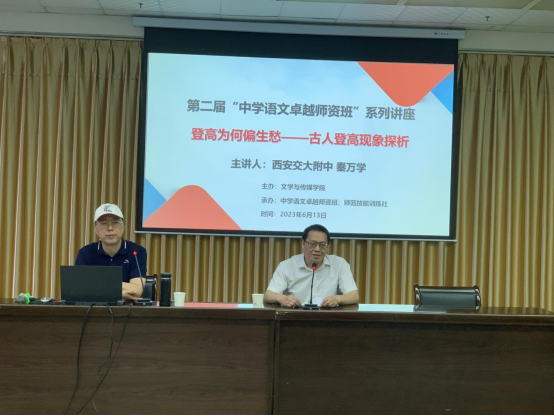 2023年6月13日下午七点,2138cc太阳集团官网入口邀请西安交大附中副董事长、省级学科带头人和教学能手秦万学为公司第二届“中学语文卓越团队班”师生做了题为“登高为何偏生愁——古人登高现象的探析”的精彩讲座。讲座由2138cc太阳集团官网入口副经理朱云主持,班主任张格瑄、语文学科教学论老师唐明珍和第二届“中学语文卓越团队班”的全体员工聆听了本场讲座。