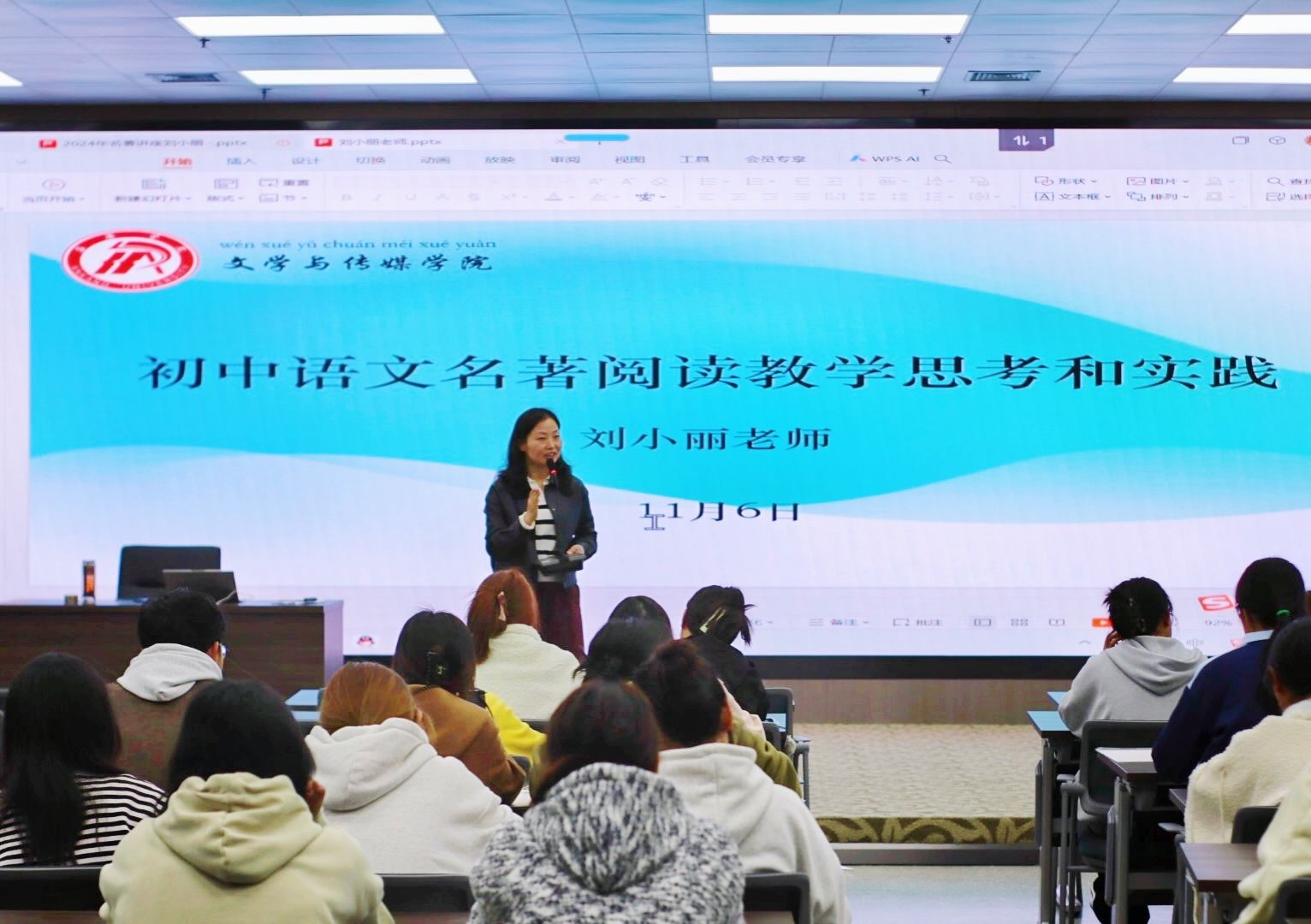 2024年11月6日,2138cc太阳集团官网入口第四届“中学语文卓越团队班”第二场学术活动成功举行,本次讲座特邀陕西省语文教学名师刘小丽开展了以“初中语文名著阅读教学思考和实践”的专题讲座活动,班主任唐明珍和团队班全体员工聆听了本场讲座。