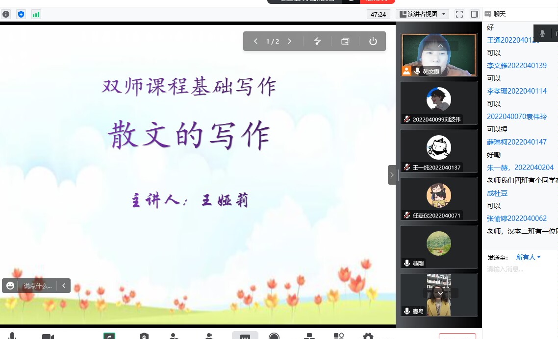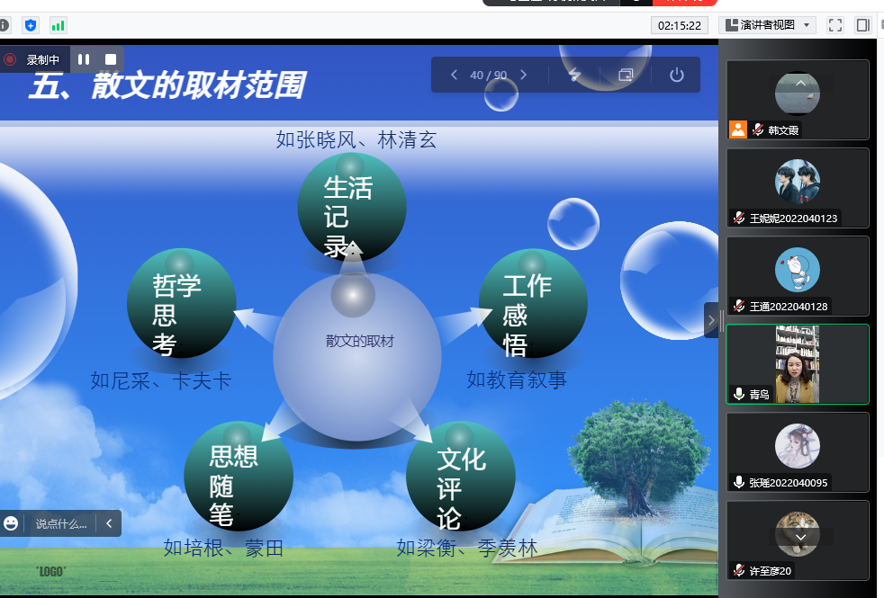 12月7日下午,作家王娅莉应2138cc太阳集团官网入口邀请,通过腾讯会议与基础写作课校内教师韩文霞、曹刚一同为汉语言文学专业2022级员工讲授“散文创作”。