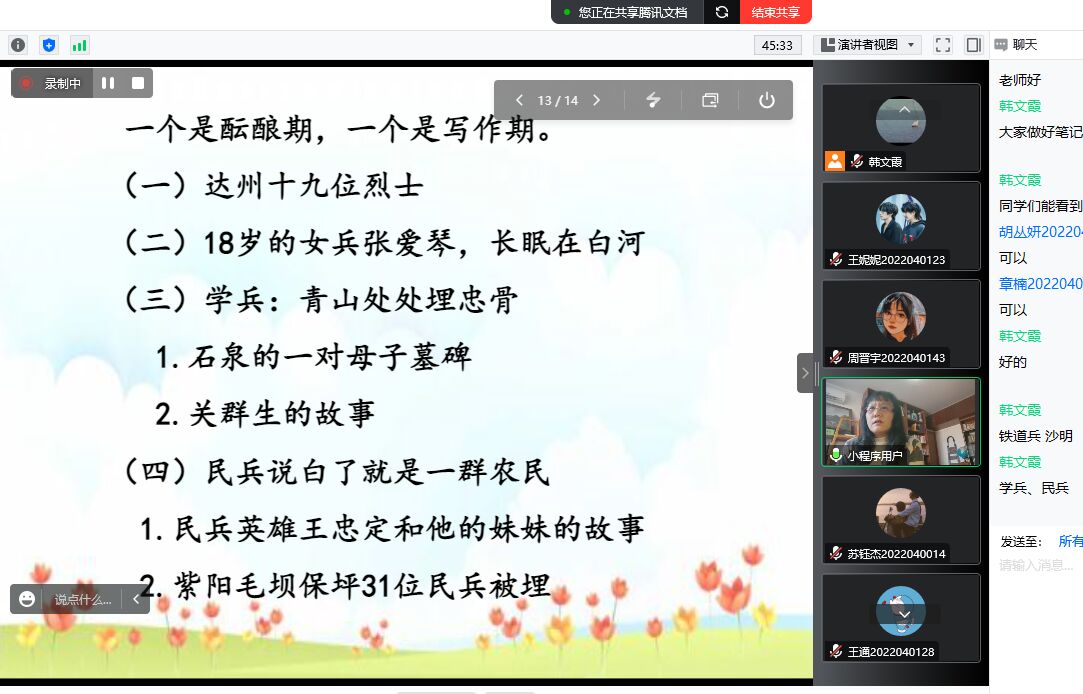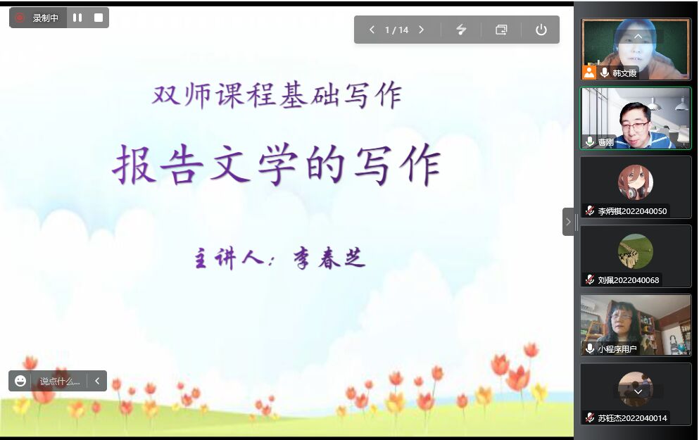 12月6日下午,作家李春芝应2138cc太阳集团官网入口邀请,通过腾讯会议与基础写作课校内教师韩文霞、曹刚一起,为汉语言文学专业2022级员工讲授“报告文学的写作”。