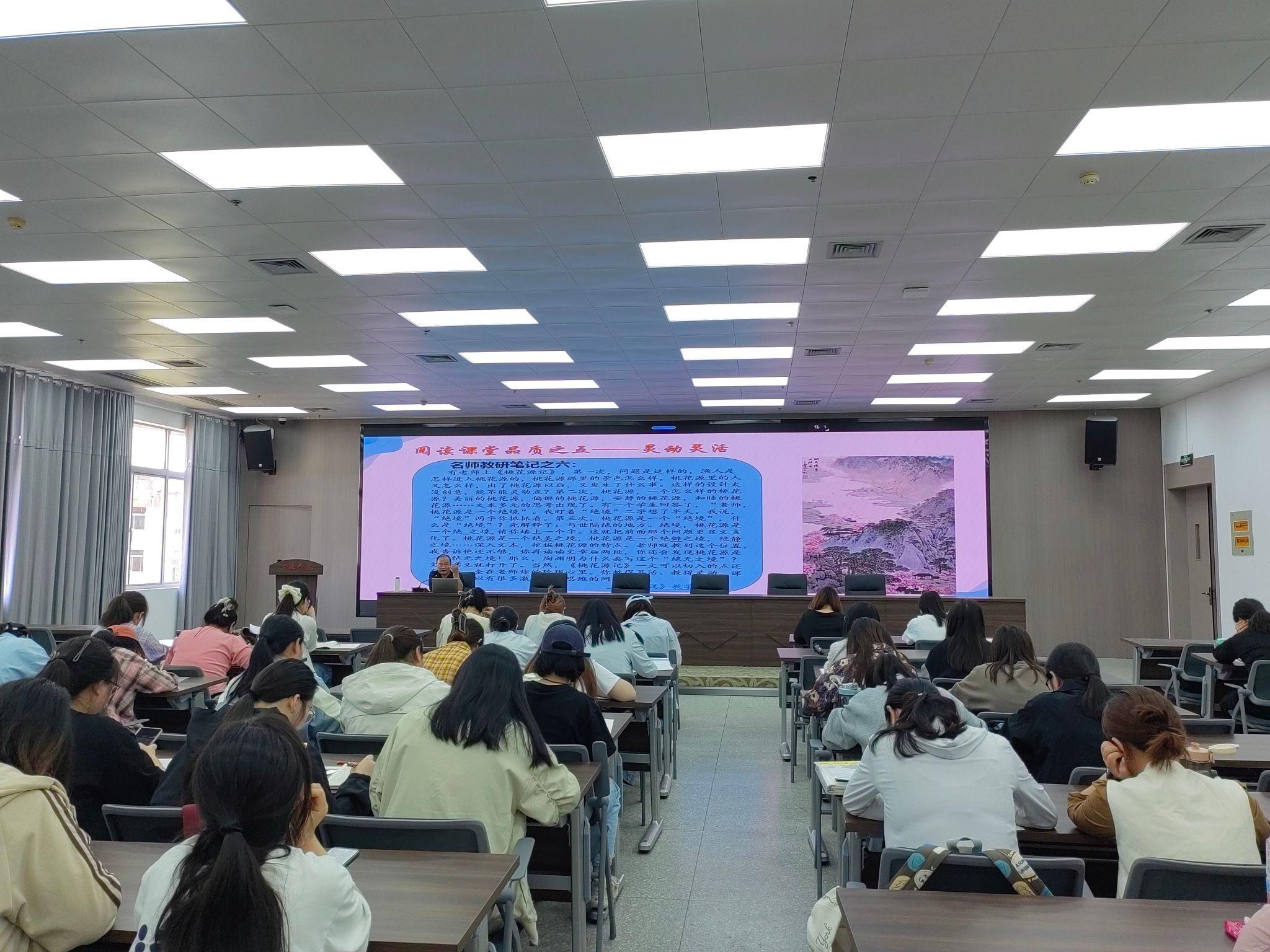 在教学实践层面,李老师创新性地提出"读、思、品、达、连”五维教学法,构建了一套完整的语文教学体系。他以《驿路梨花》《从百草园到三味书屋》《秋天的怀念》等经典篇目为例,详细解析五维教学法在实际教学中的应用路径。深入浅出地阐释如何精准抓住关键词句,引领员工一步步走进文本,深切体会语言那动人心弦的魅力。李老师着重强调语文教学来不得半点虚假,需坚守本真本色,以实实在在的教学内容与方法,夯实语文教育的根基。此外,他还分享了五个独特的文本解读视角,为同学们提供了深入挖掘文本价值的专业方法与思路。